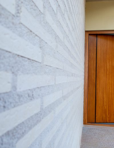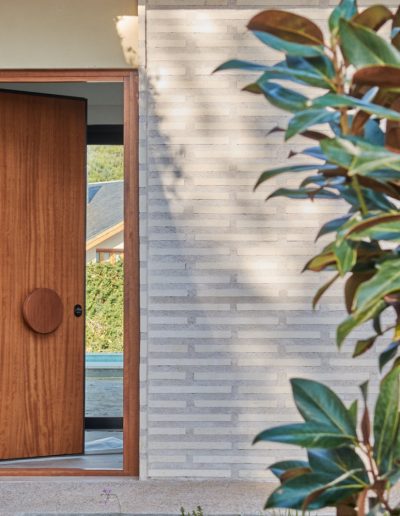 - Hoja de gran tamaño con acabado en madera natural, aportando calidez frente a materiales minerales