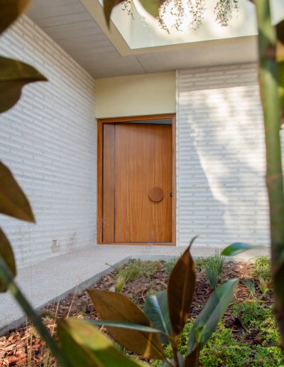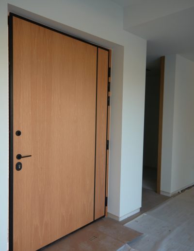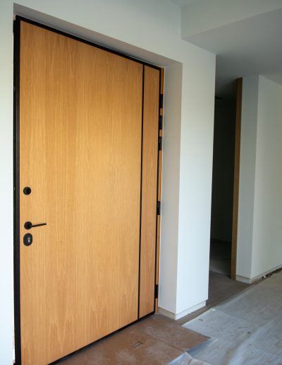 Se ha ejecutado la instalación de una puerta acorazada pivotante de gran formato, integrada en un acceso tipo patio interior que potencia la iluminación natural y la privacidad.