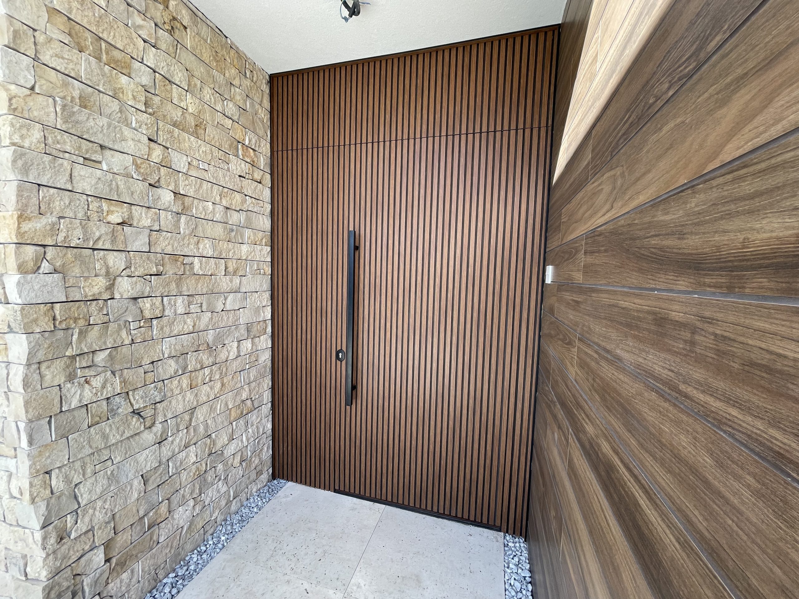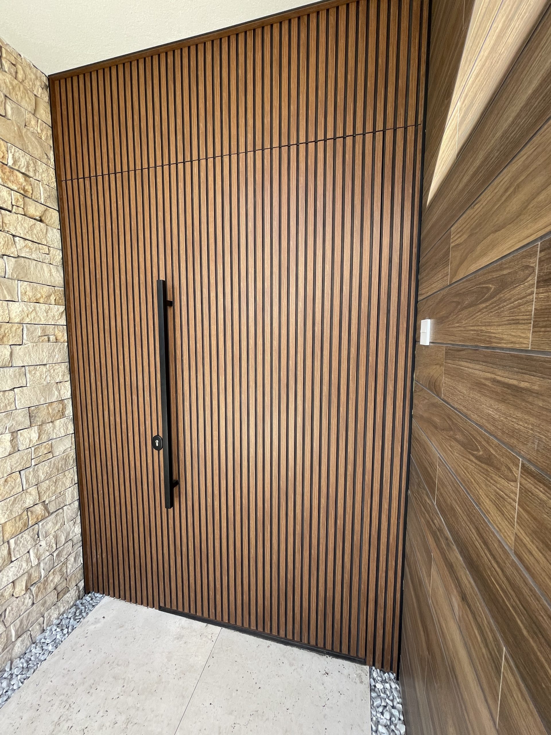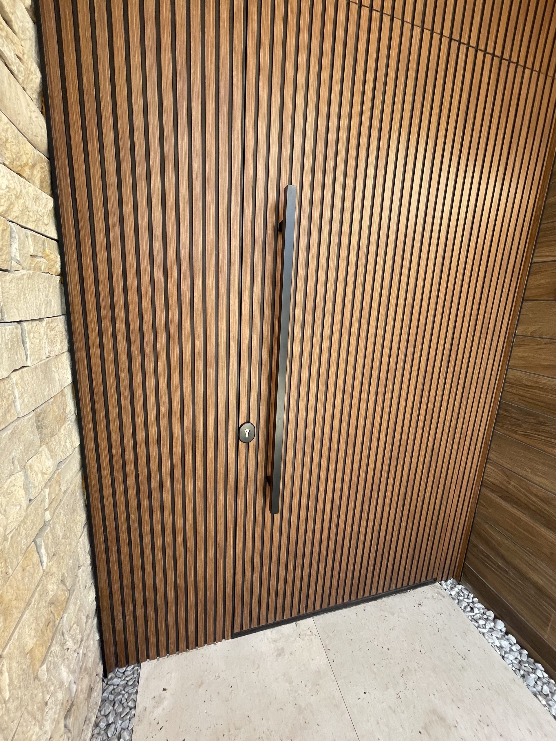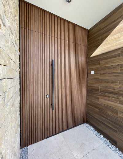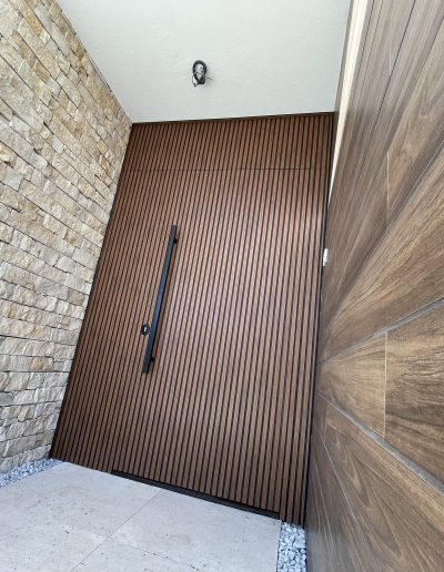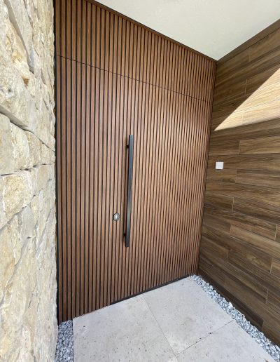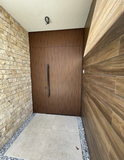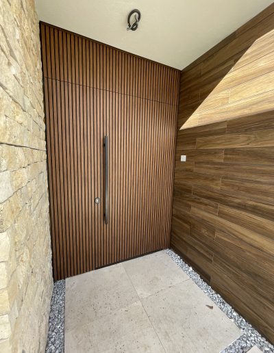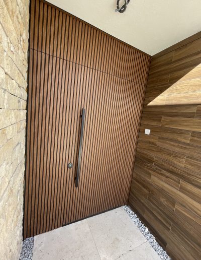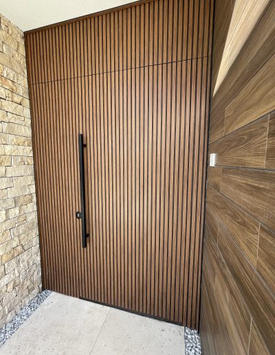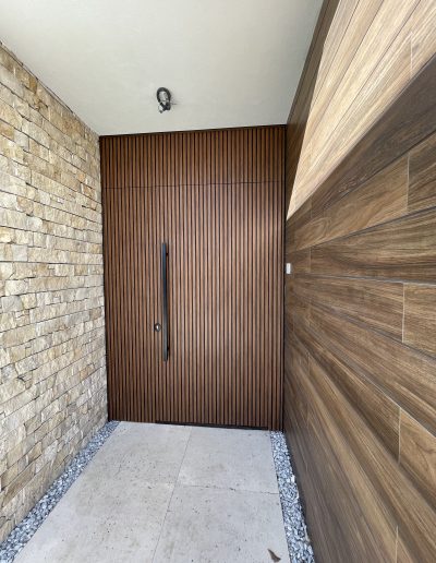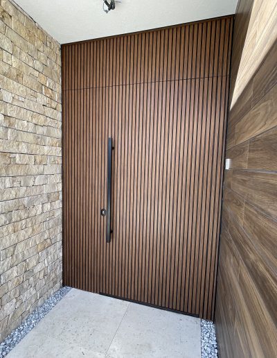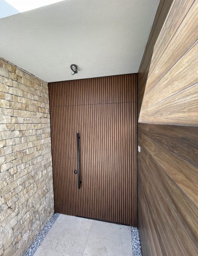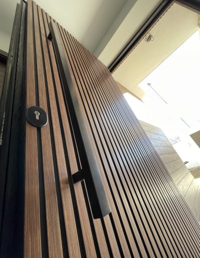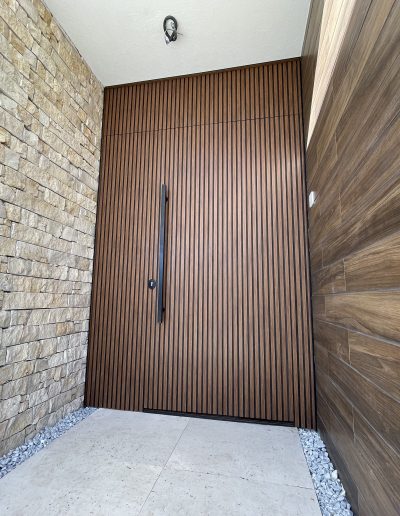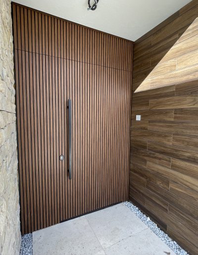 La puerta no se concibe como un elemento independiente, sino como parte del diseño global del espacio, donde la palillería vertical actúa como recurso estético principal, generando ritmo, profundidad y una sensación de mayor altura.