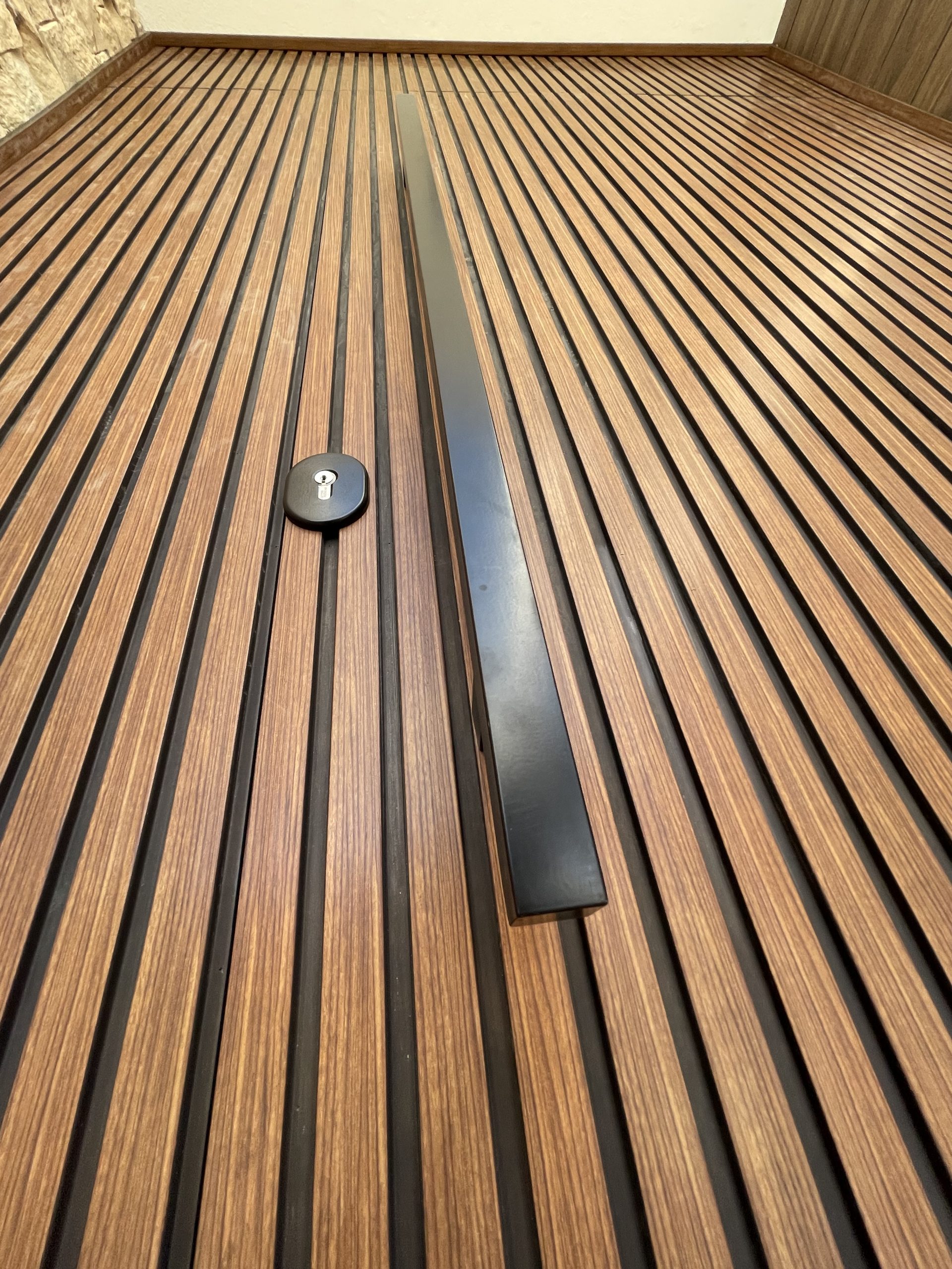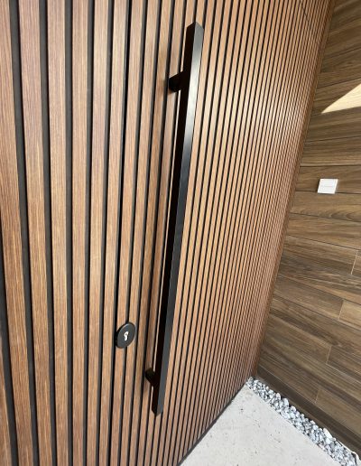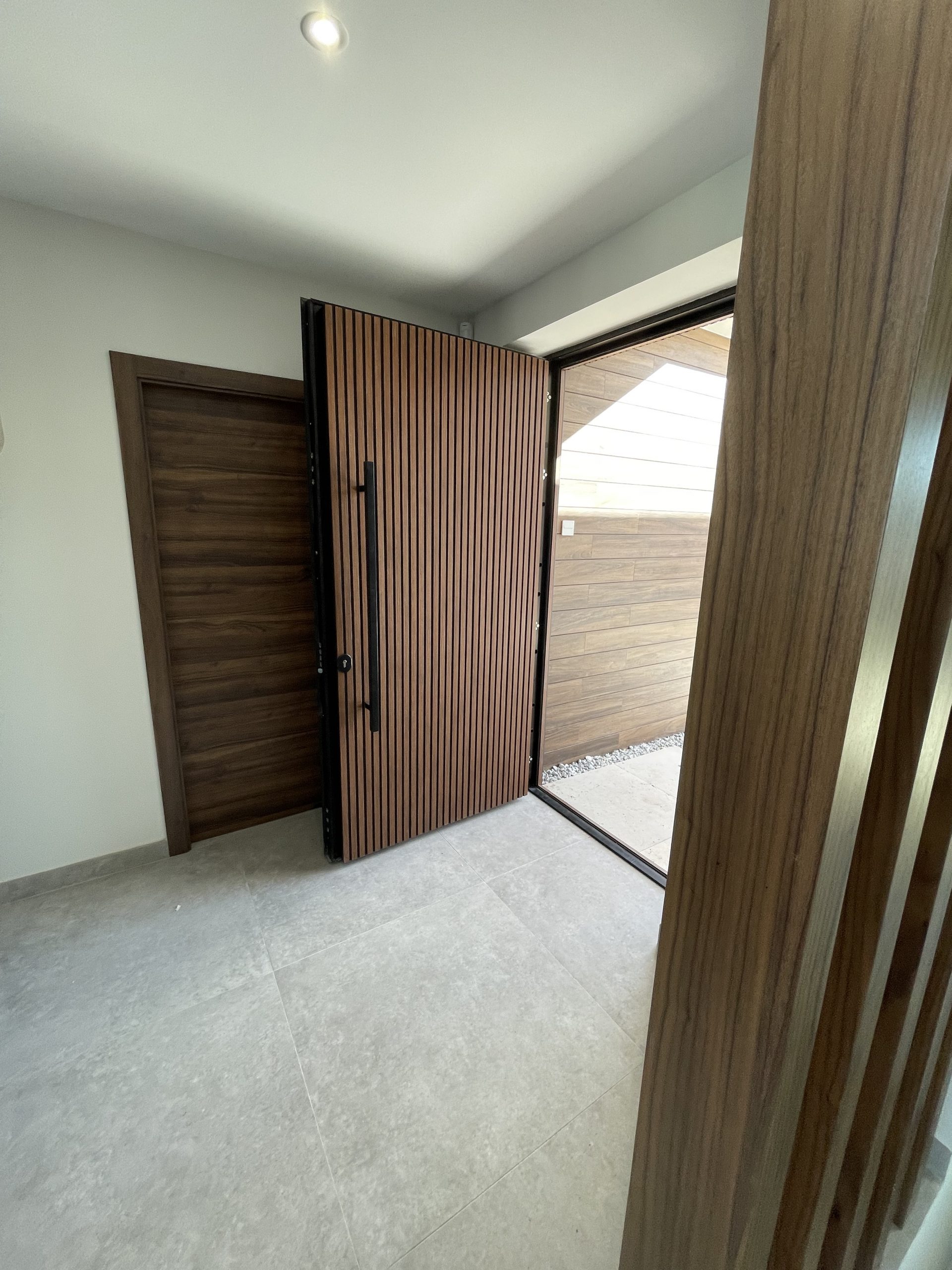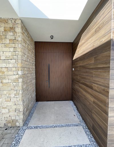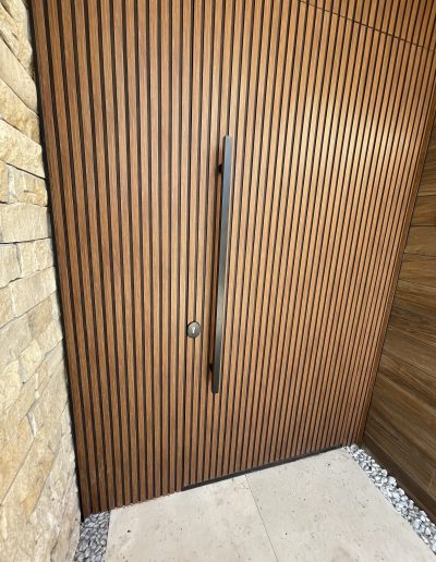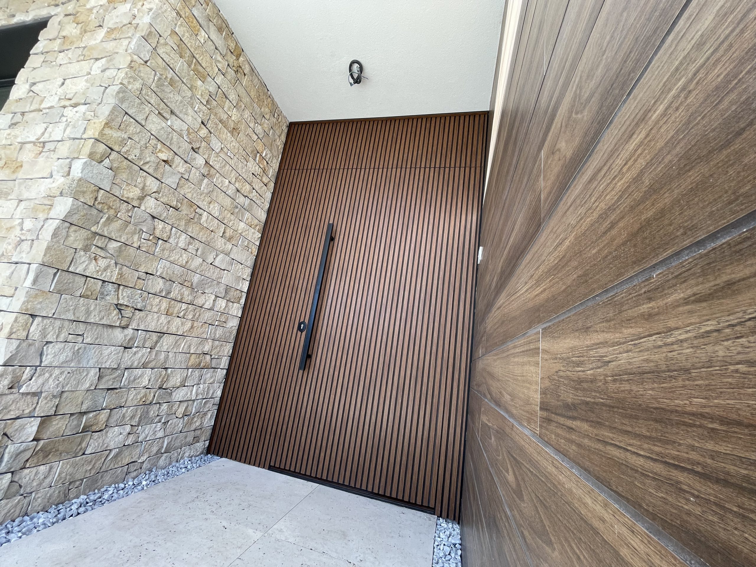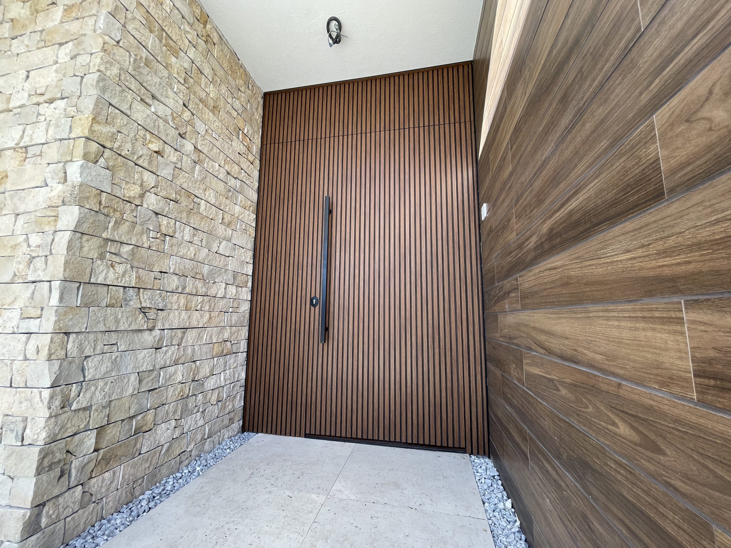 La puerta no se concibe como un elemento independiente, sino como parte del diseño global del espacio, donde la palillería vertical actúa como recurso estético principal, generando ritmo, profundidad y una sensación de mayor altura.