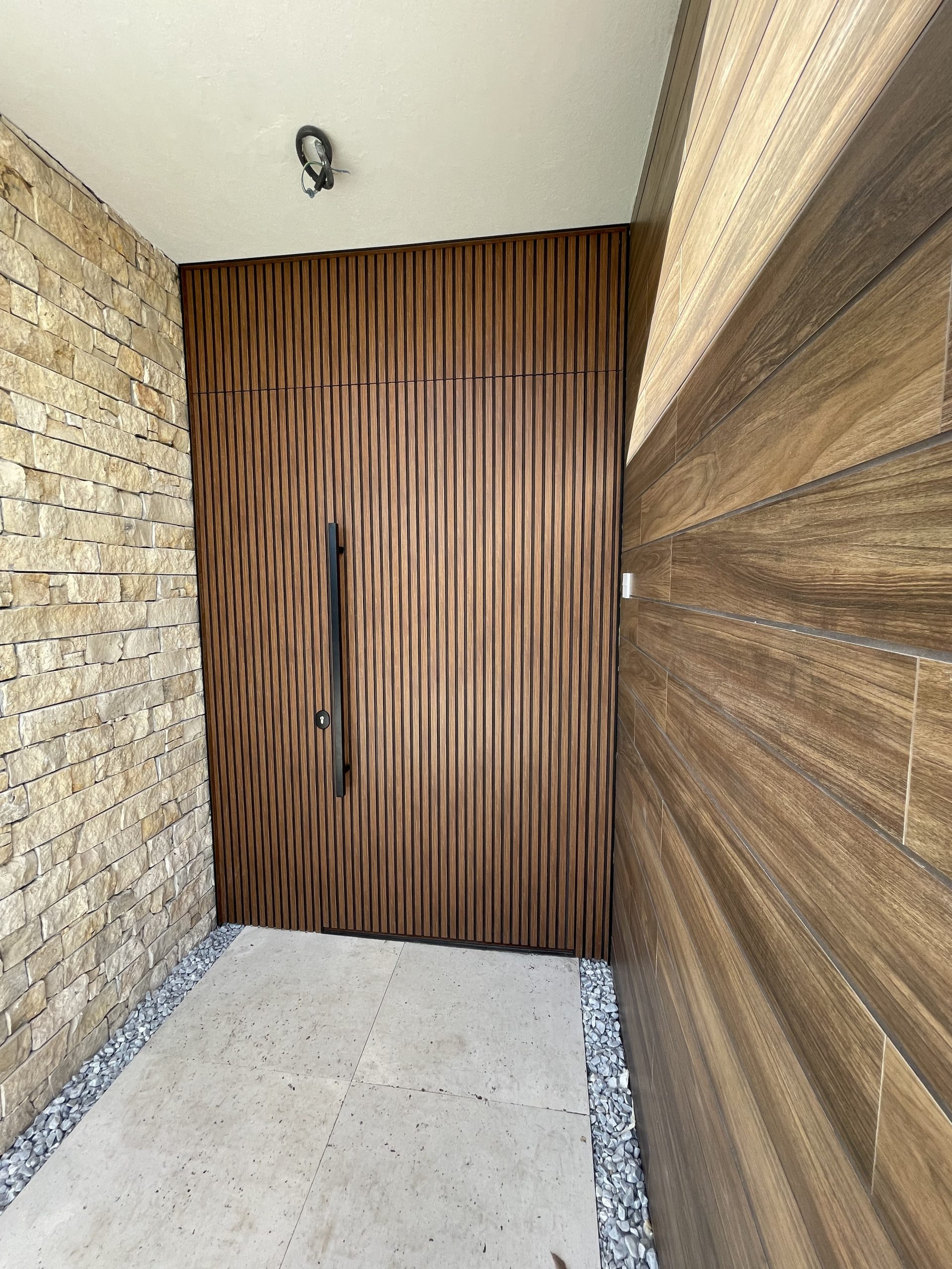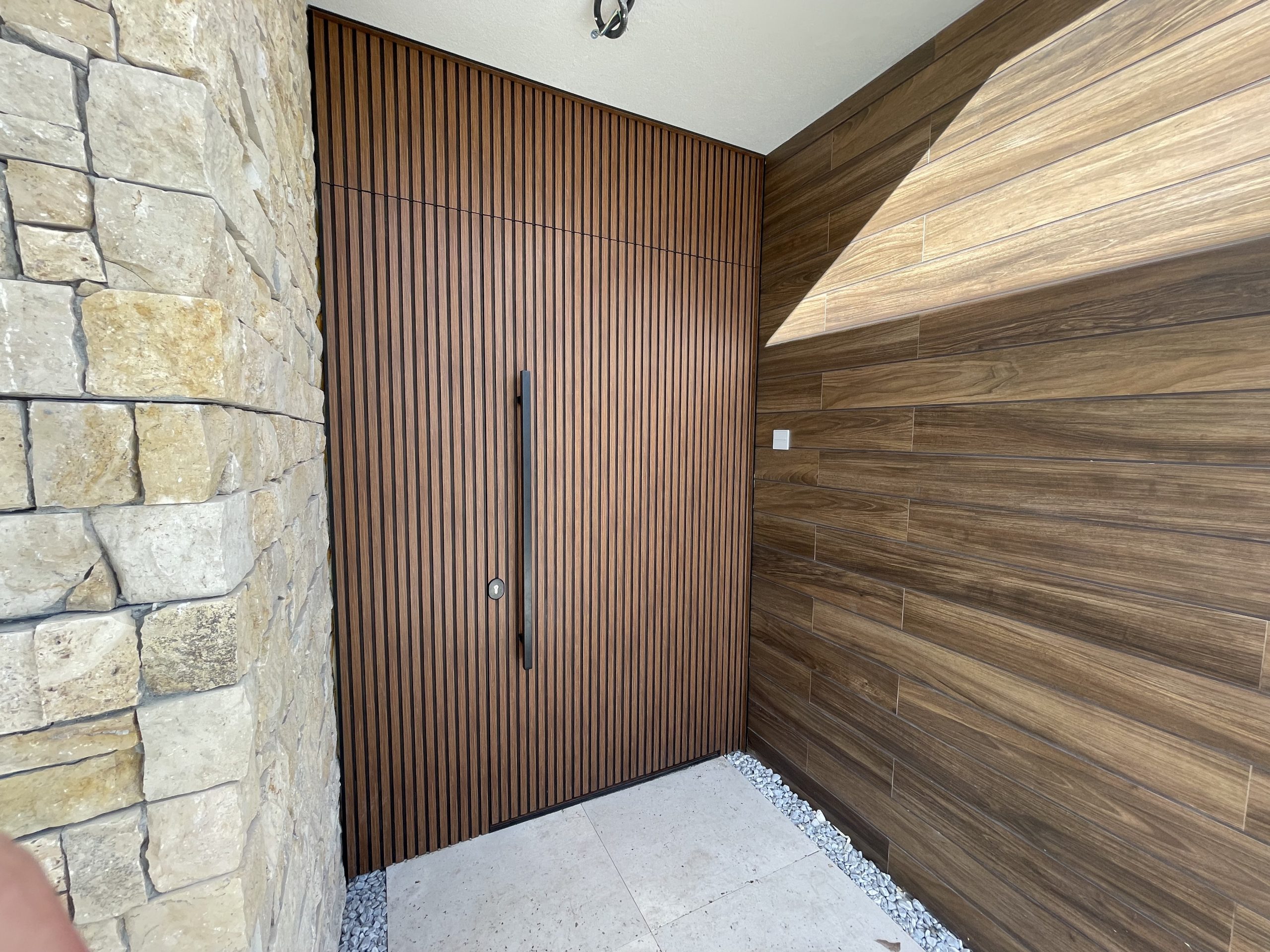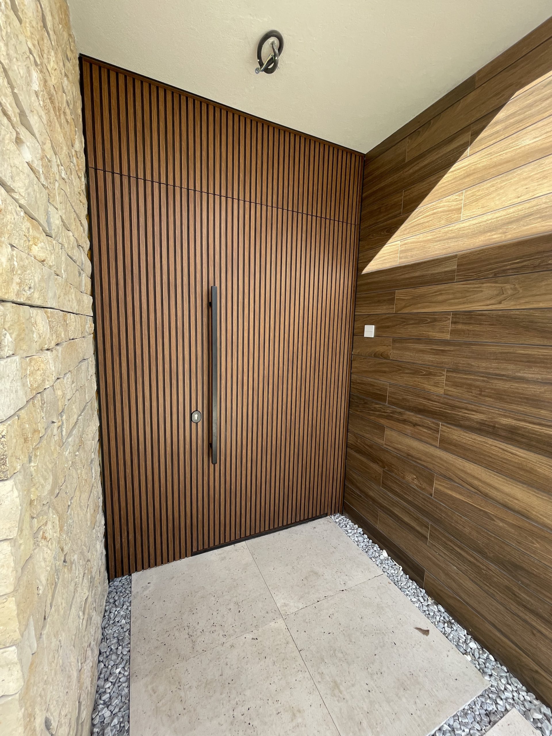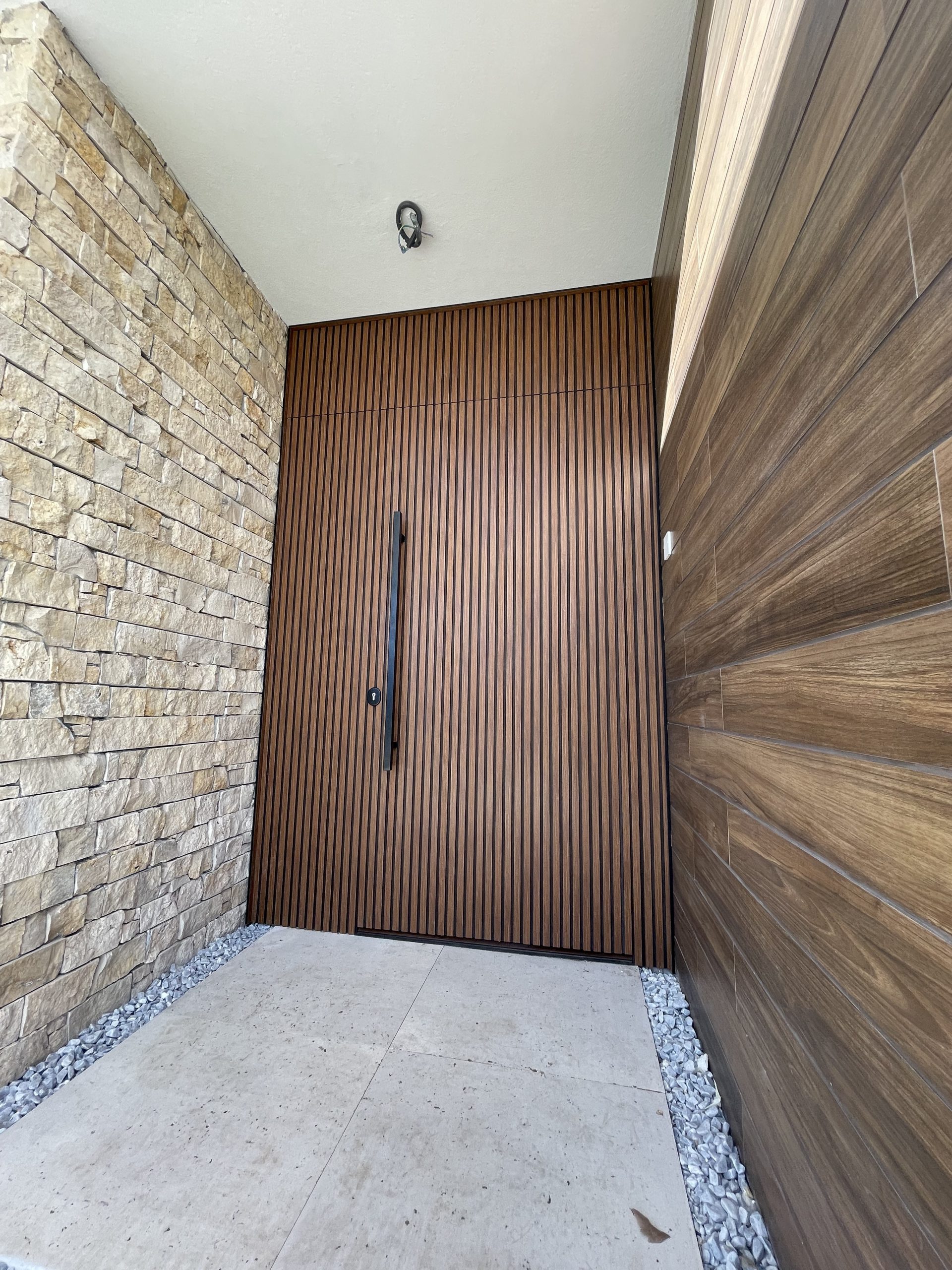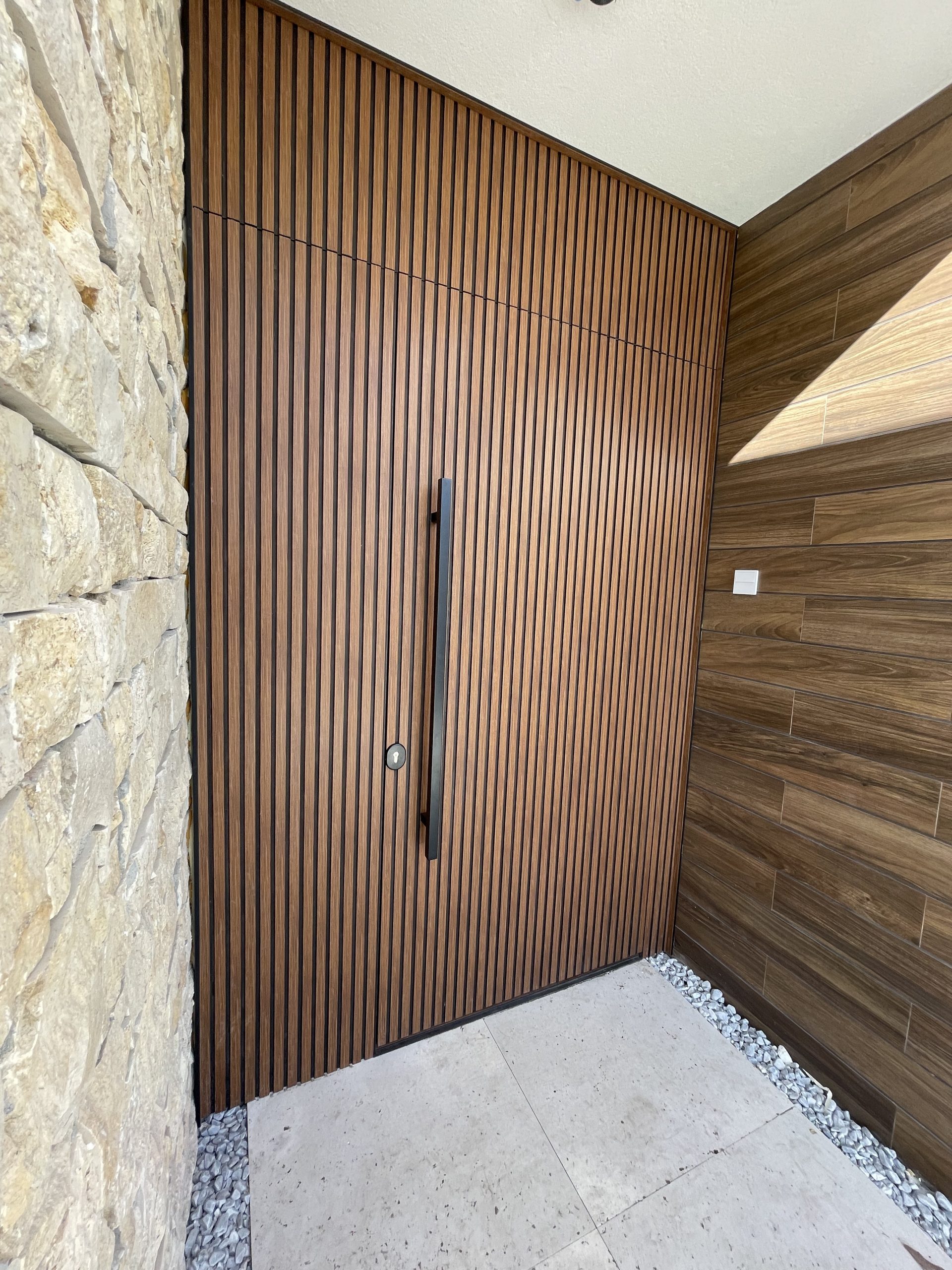 La puerta no se concibe como un elemento independiente, sino como parte del diseño global del espacio, donde la palillería vertical actúa como recurso estético principal, generando ritmo, profundidad y una sensación de mayor altura.