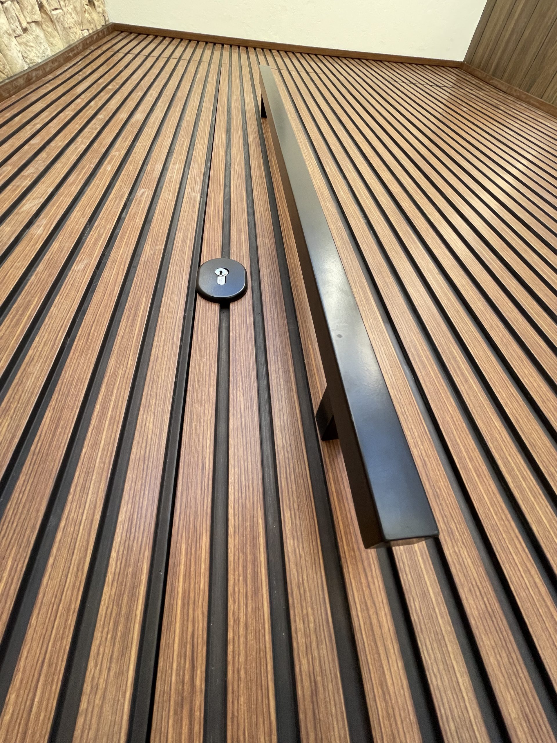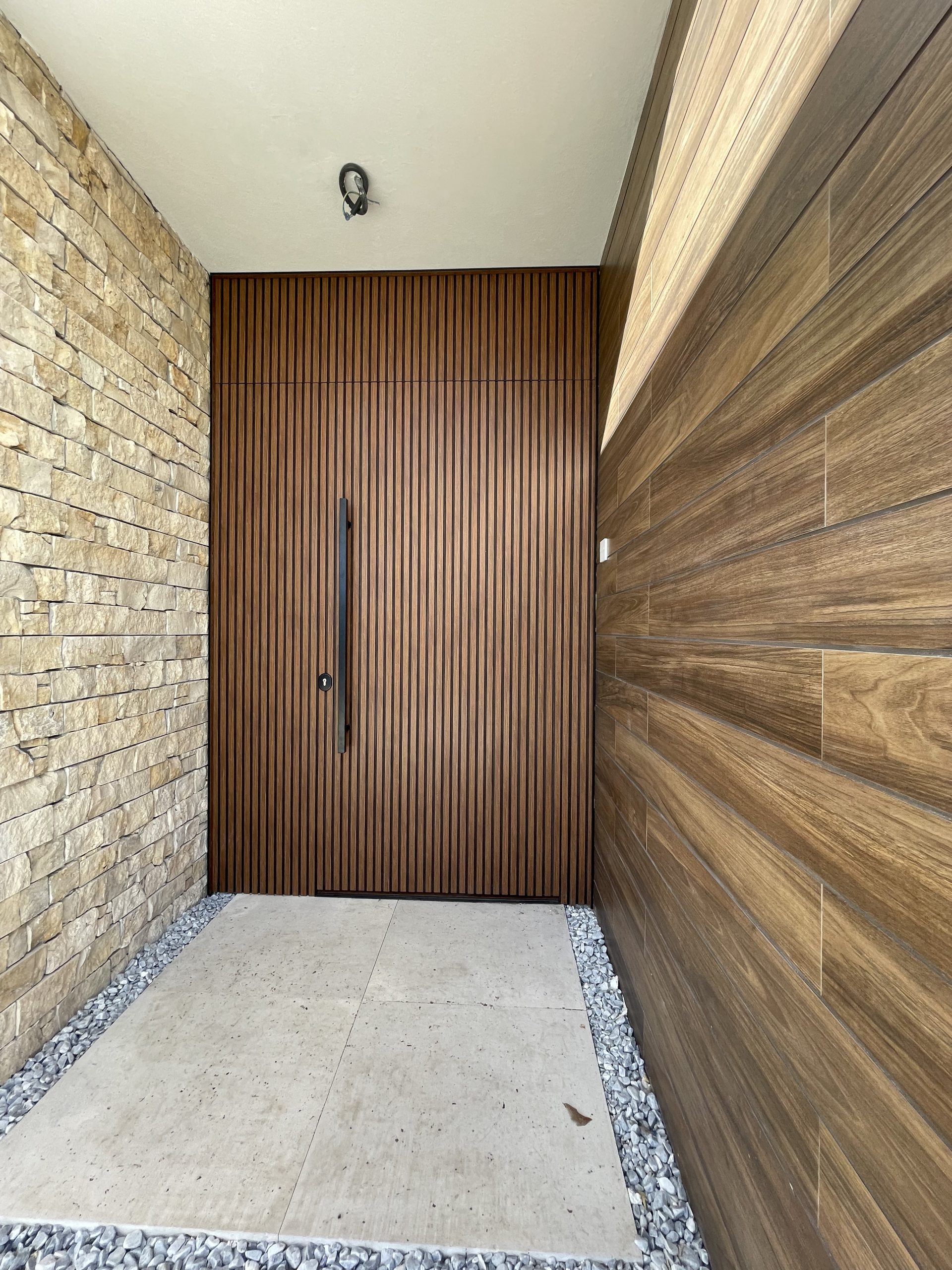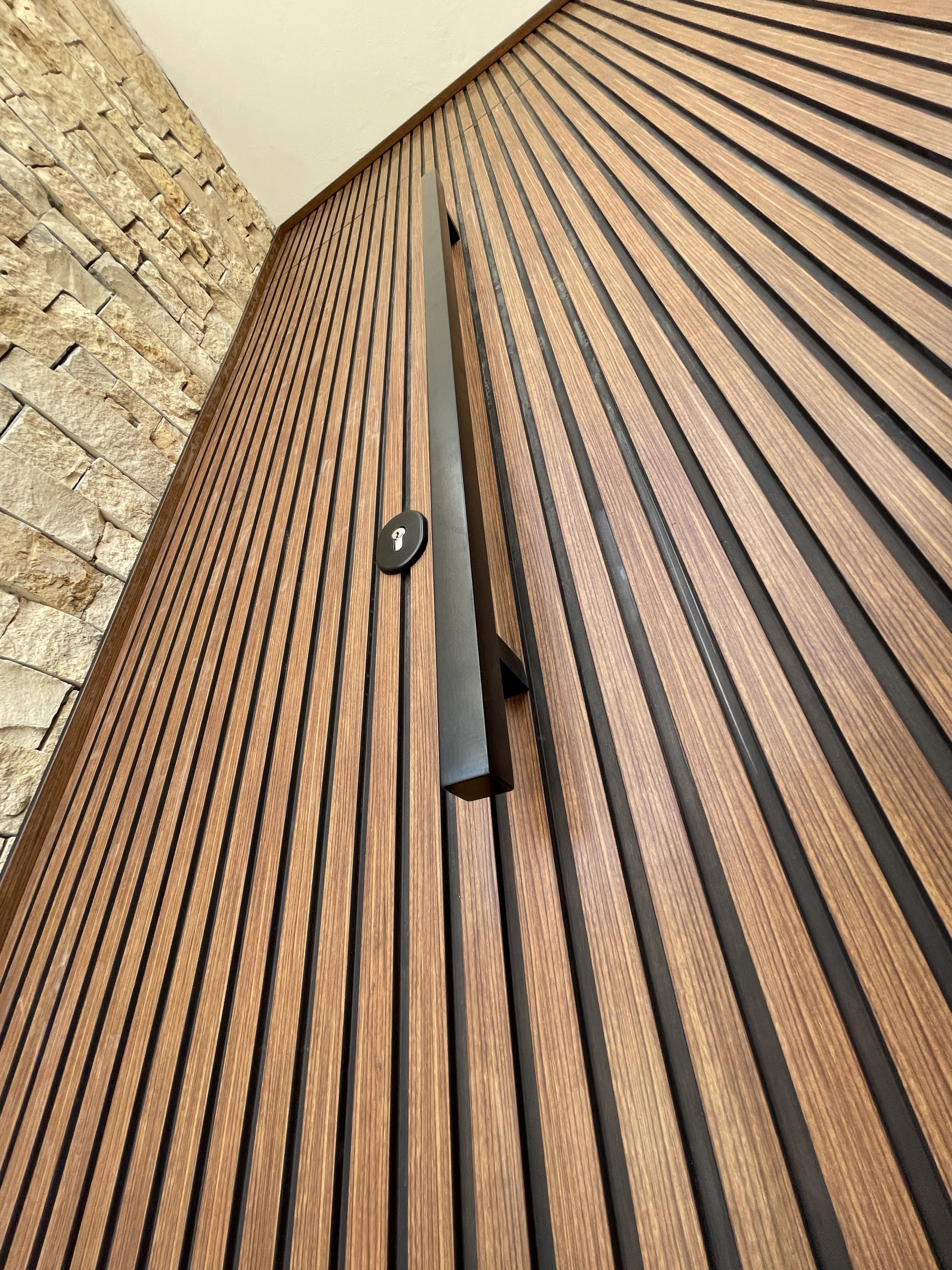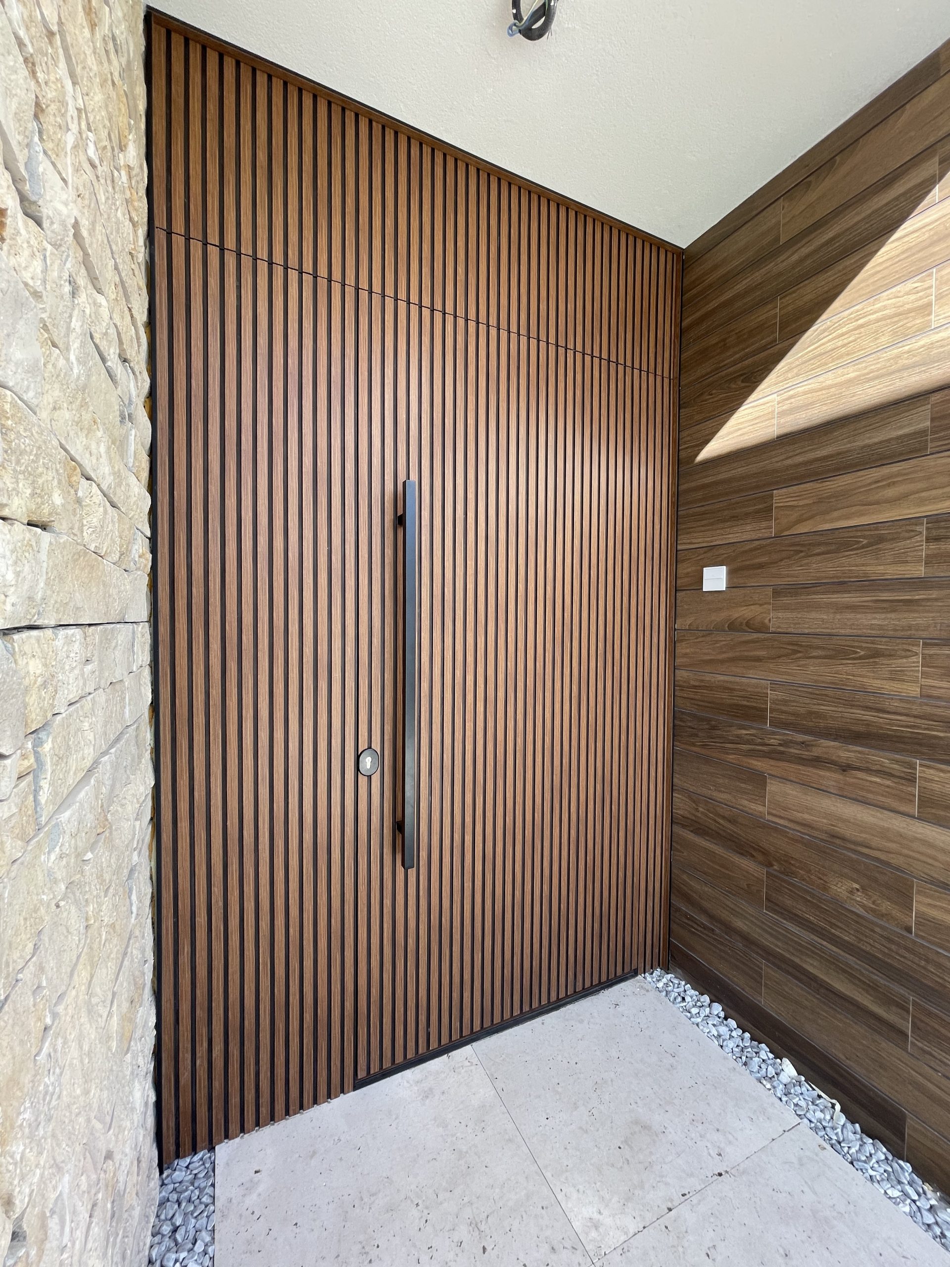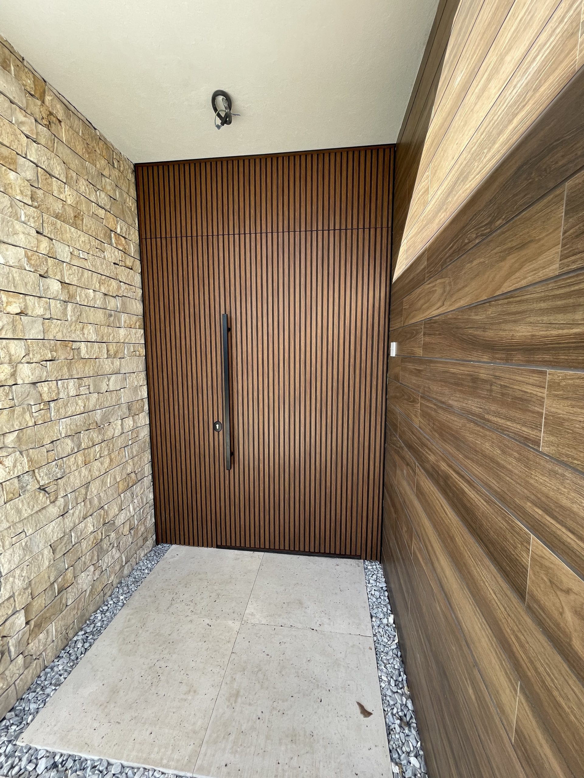 La puerta no se concibe como un elemento independiente, sino como parte del diseño global del espacio, donde la palillería vertical actúa como recurso estético principal, generando ritmo, profundidad y una sensación de mayor altura.