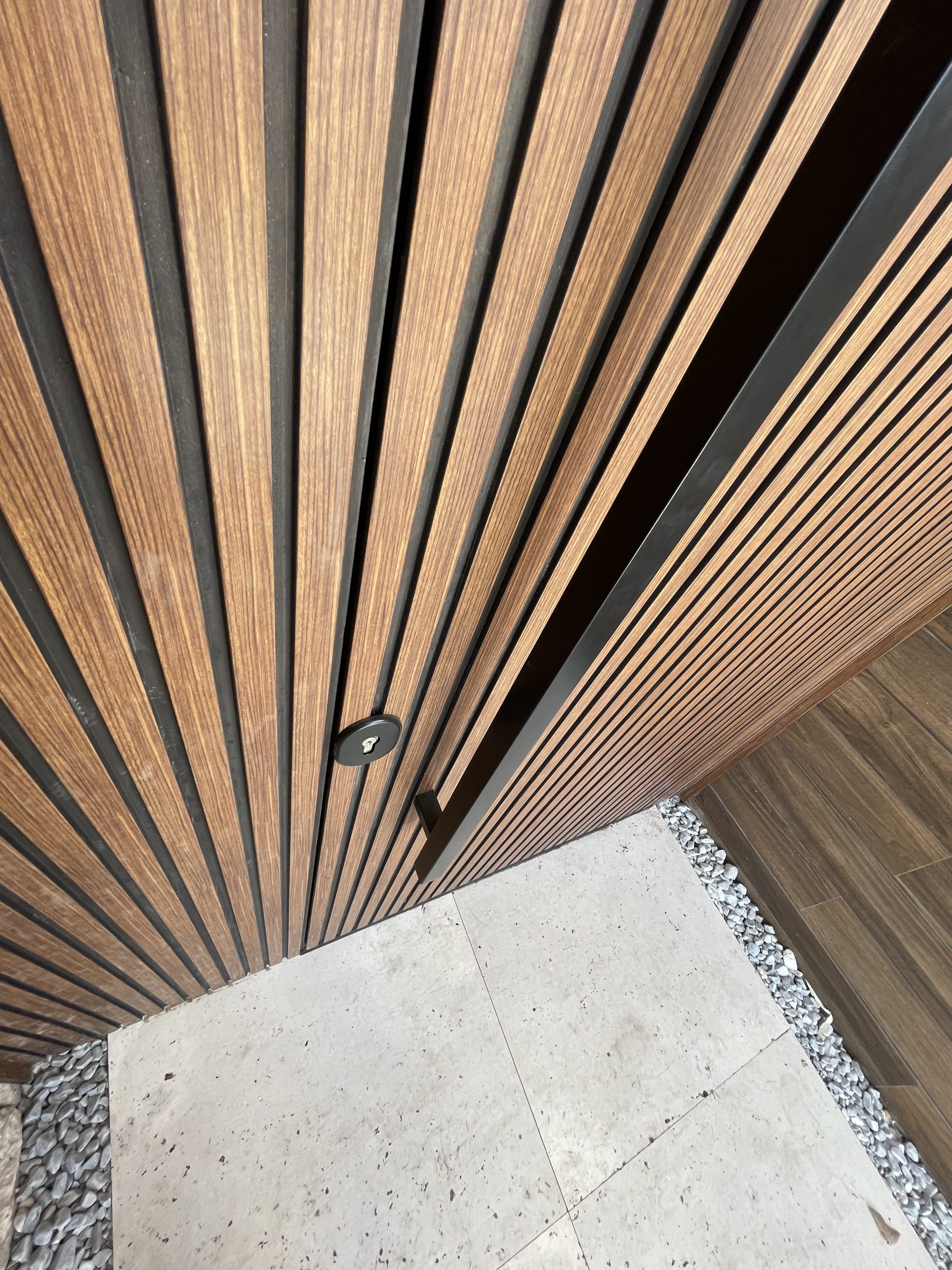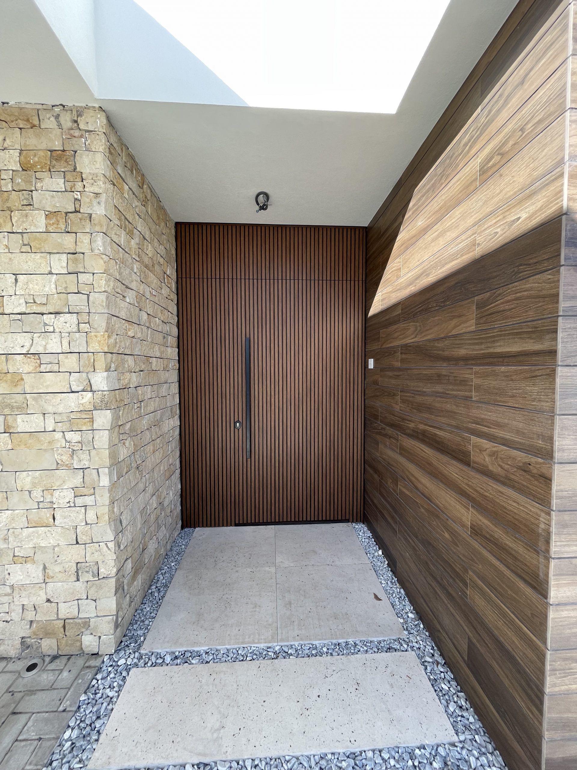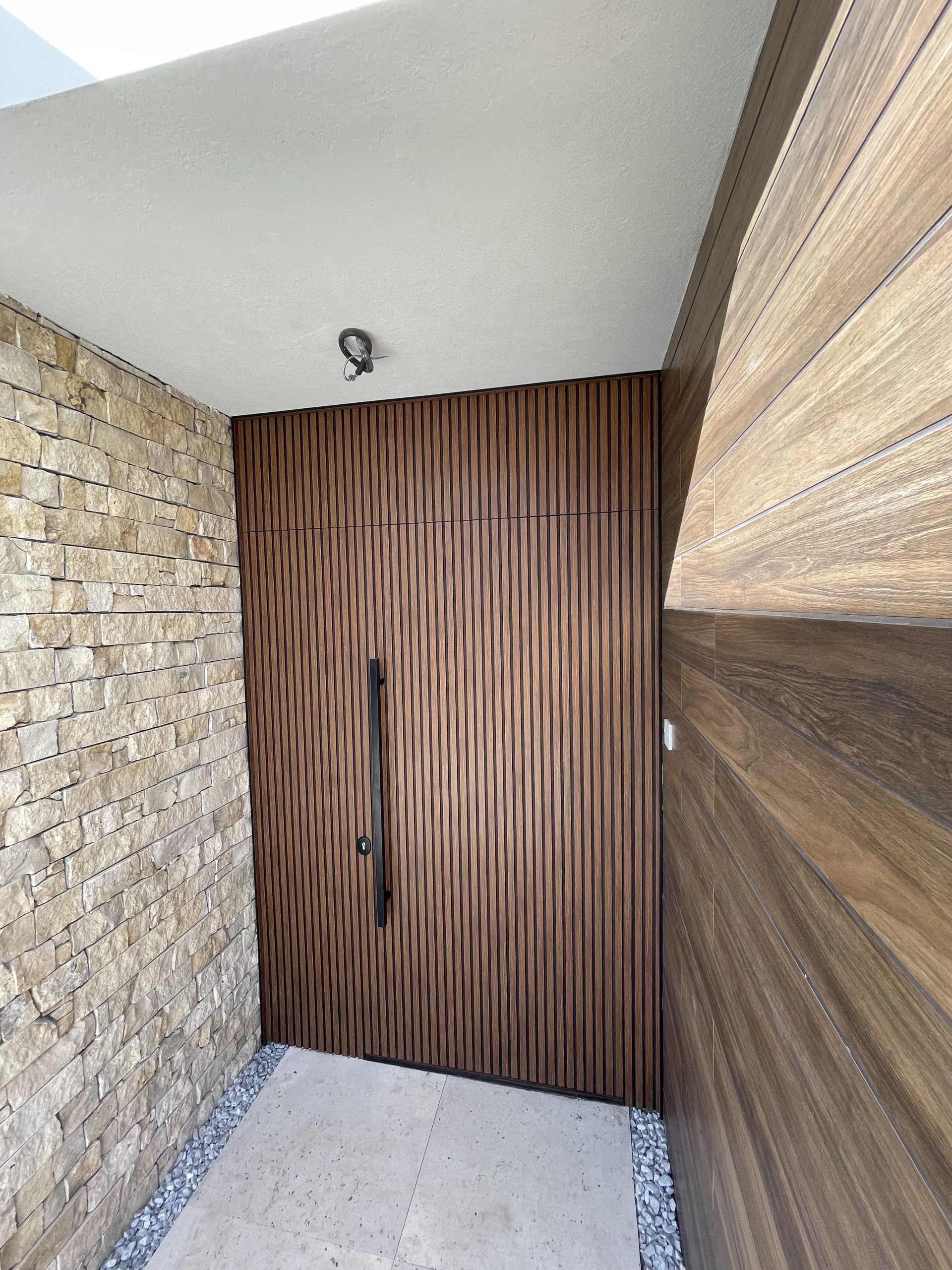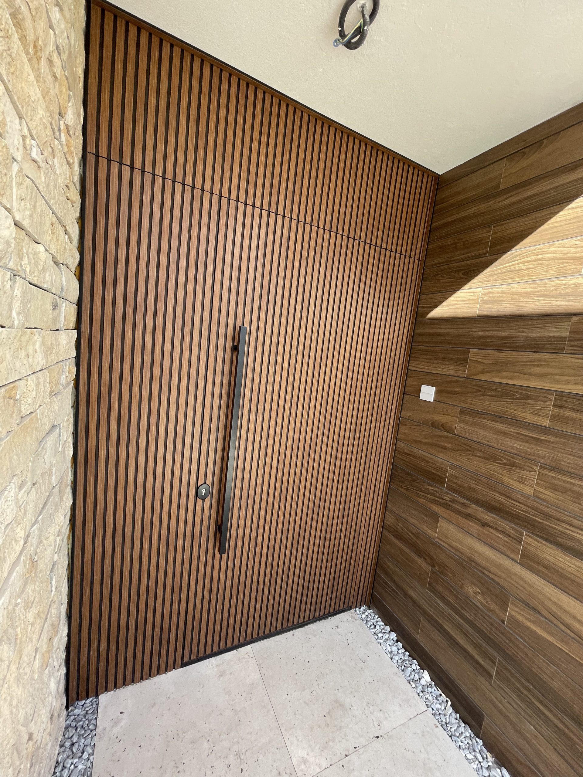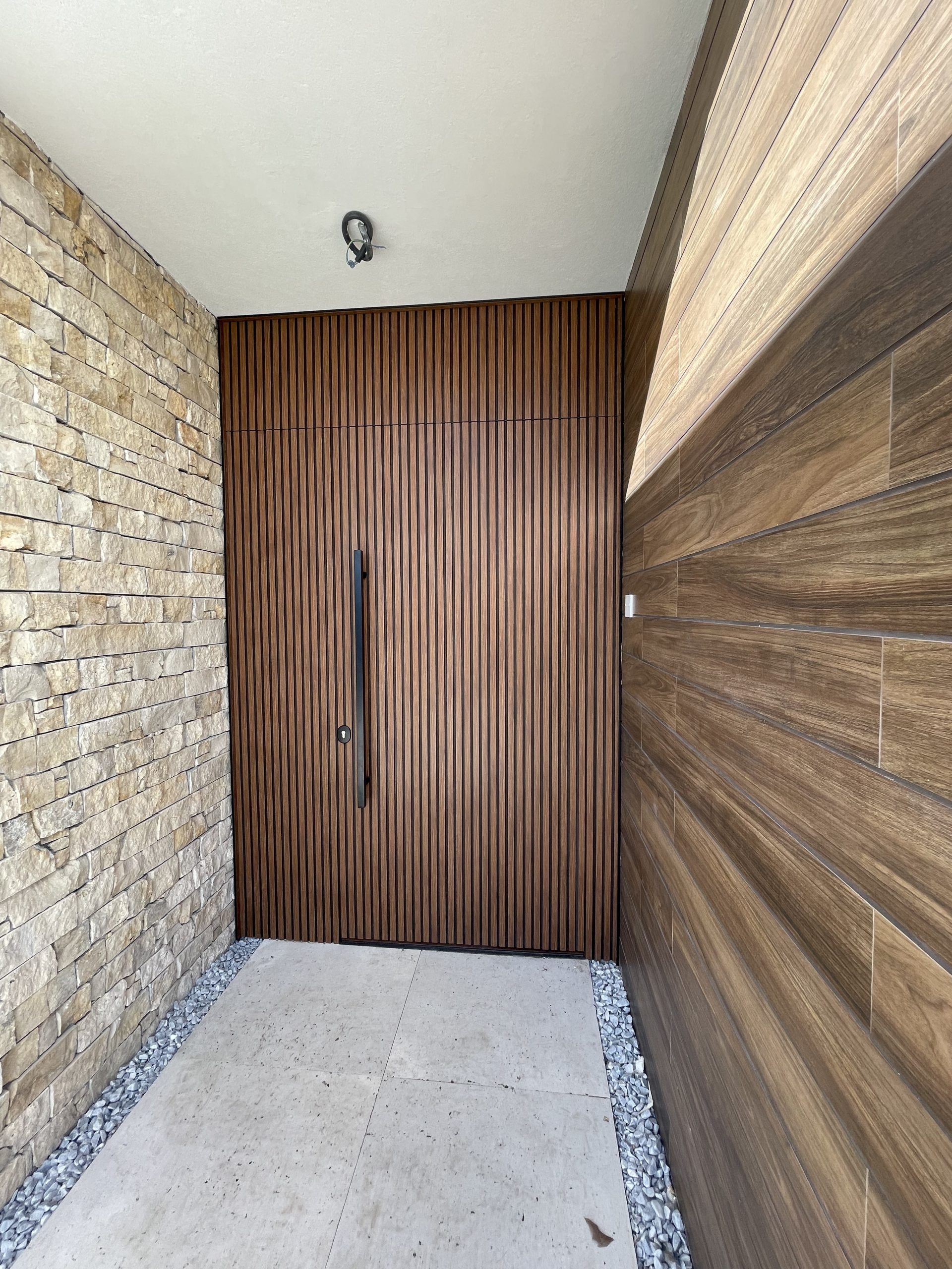La puerta no se concibe como un elemento independiente, sino como parte del diseño global del espacio, donde la palillería vertical actúa como recurso estético principal, generando ritmo, profundidad y una sensación de mayor altura.