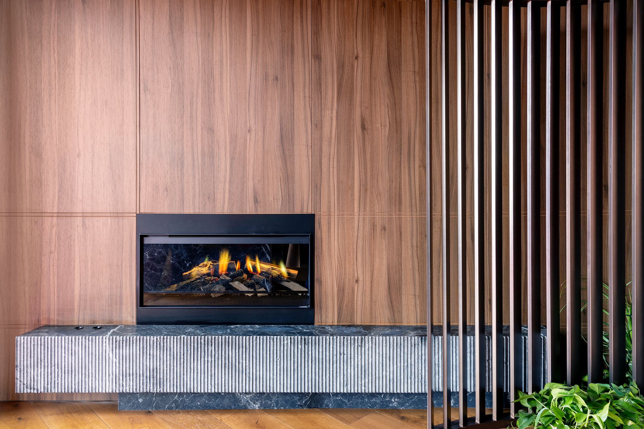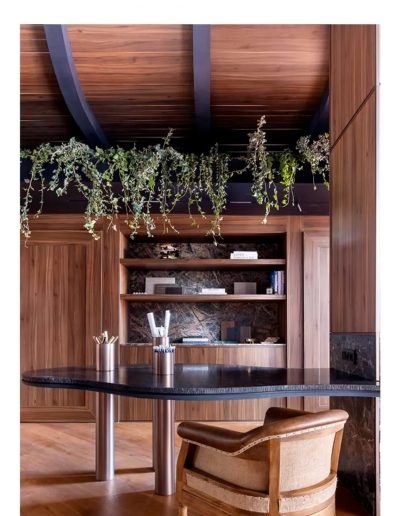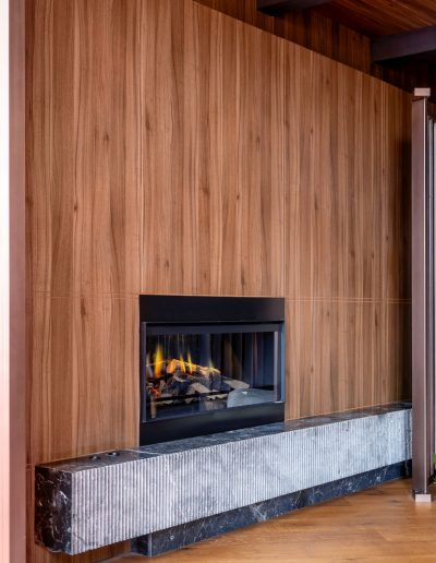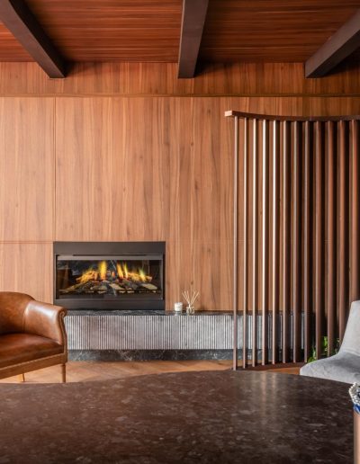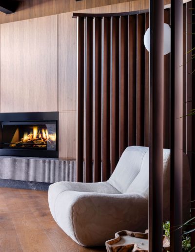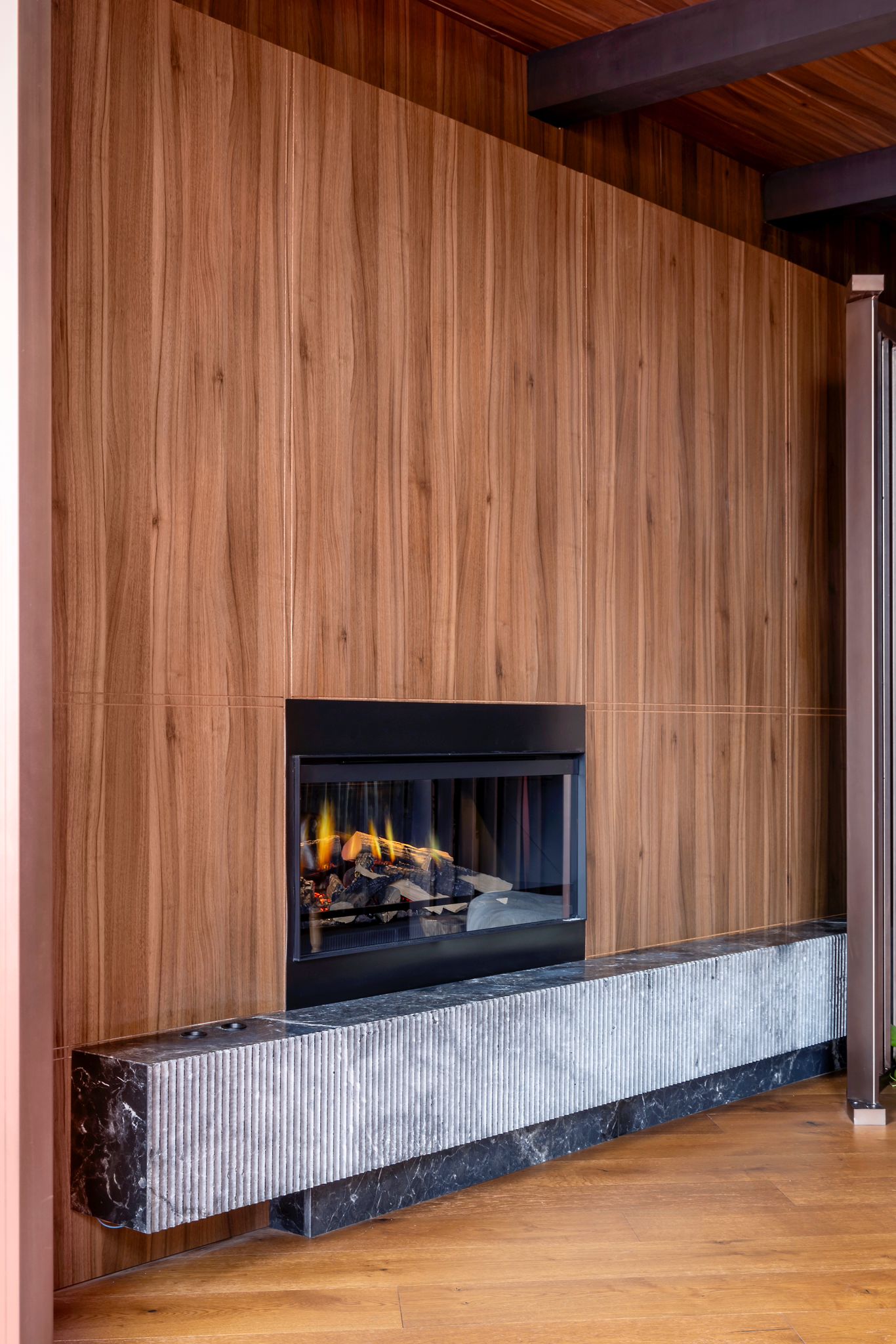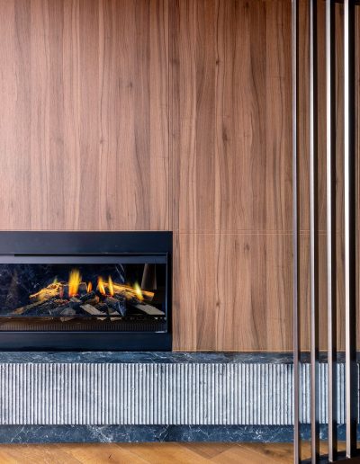 - Panelado vertical en madera natural, ejecutado con precisión para generar continuidad visual