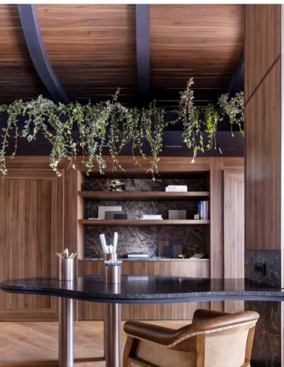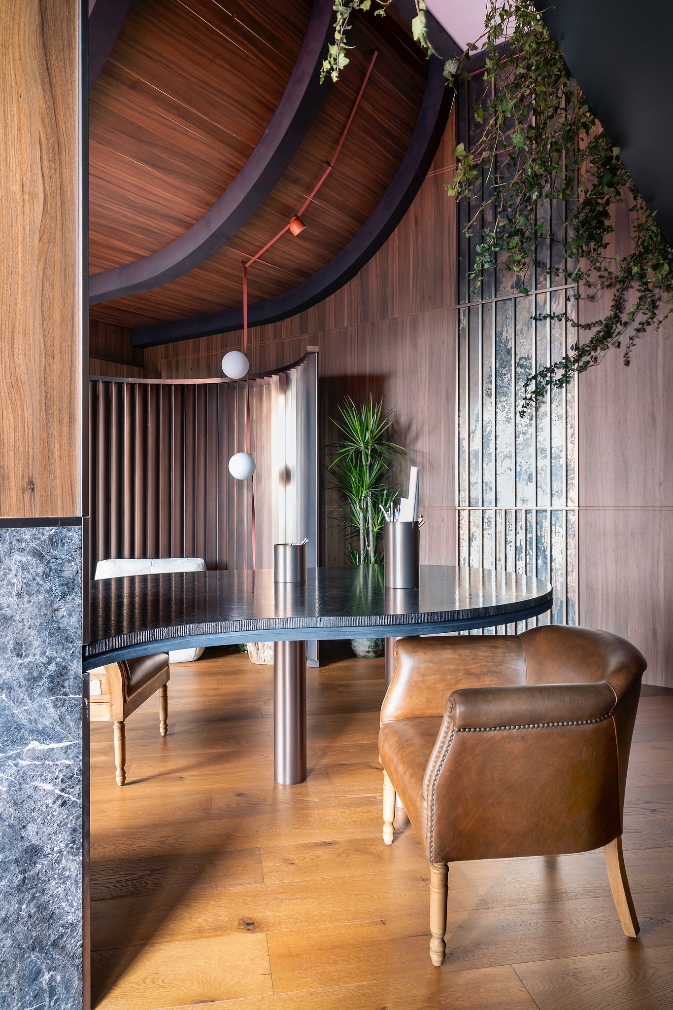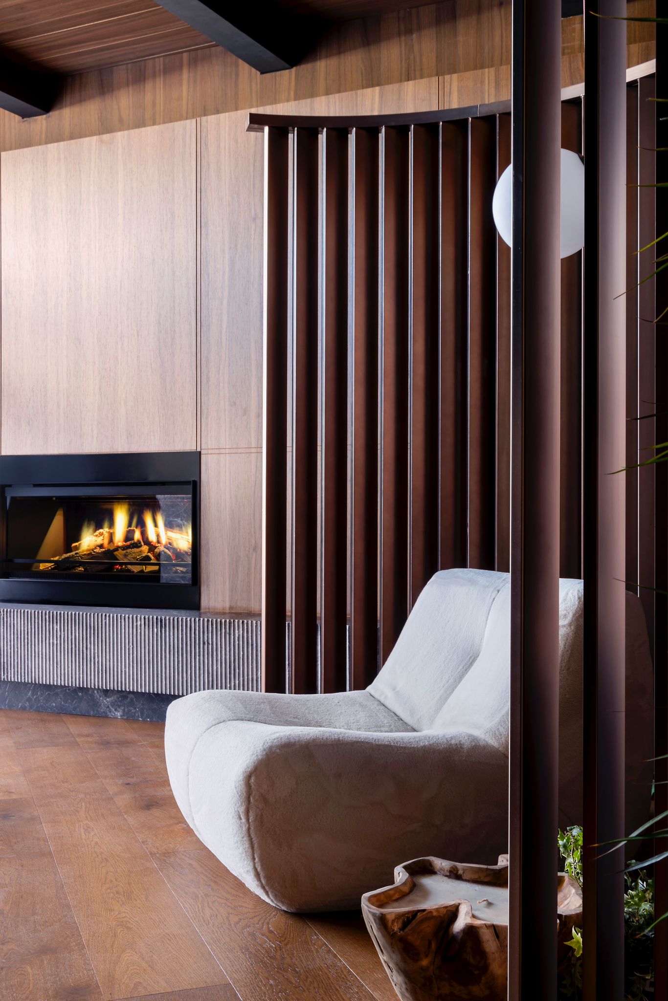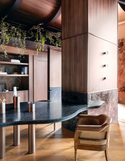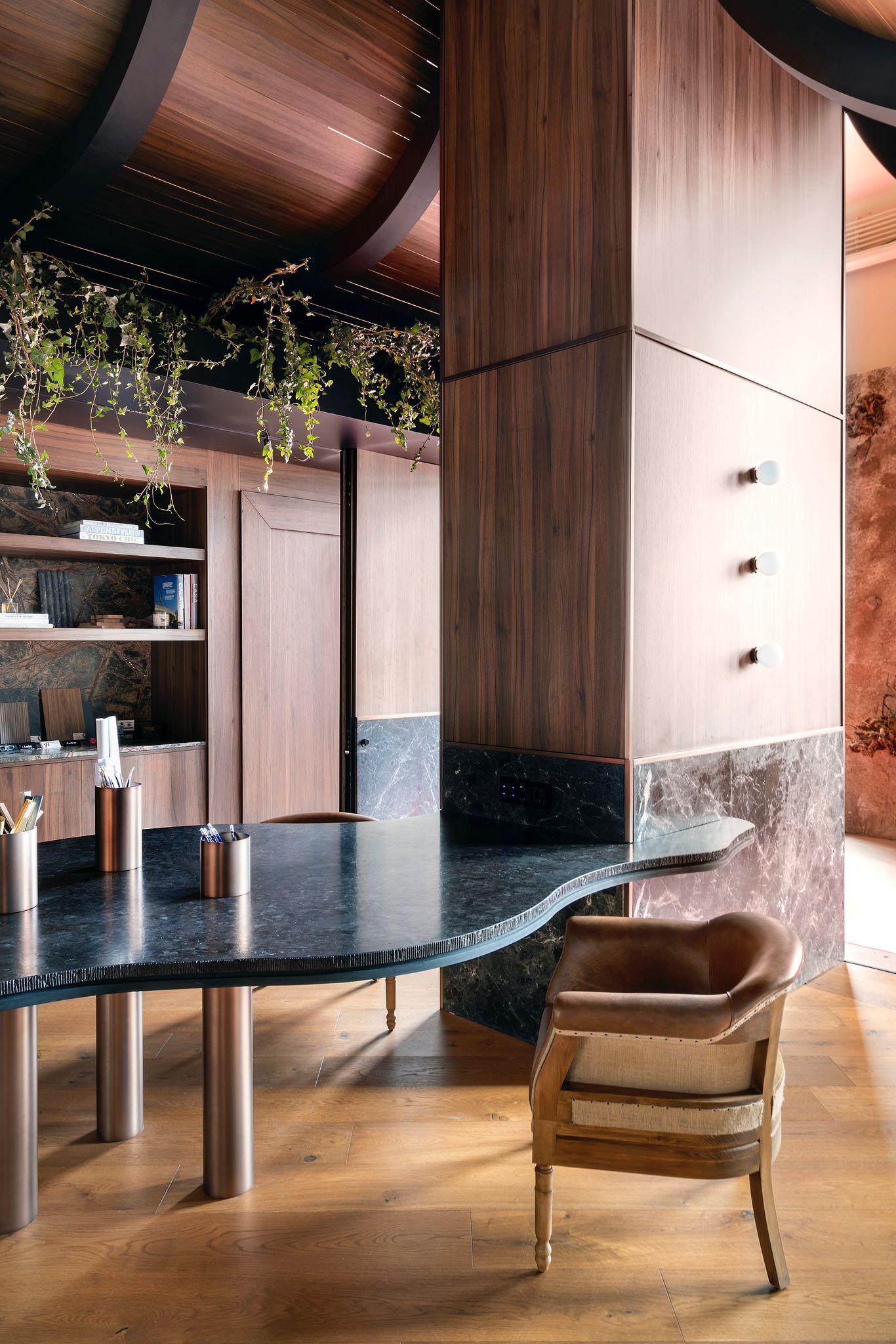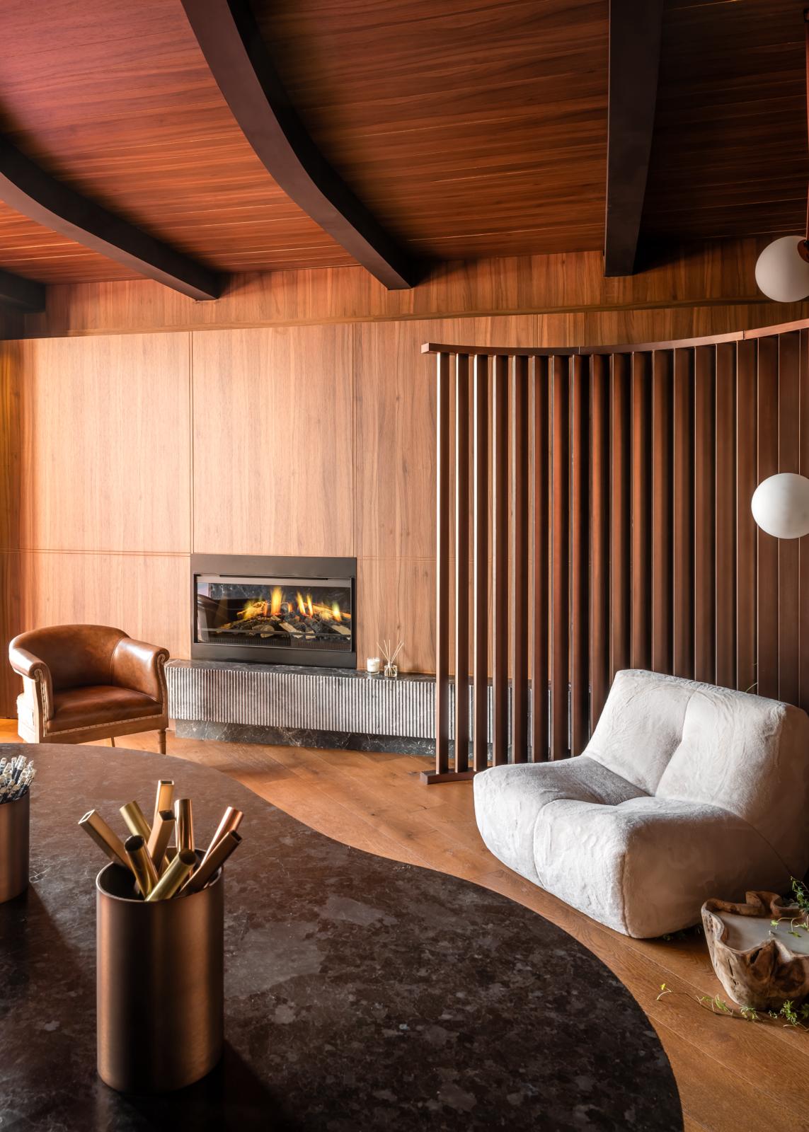 Revestimiento interior de diseño con madera, piedra natural y geometría curva