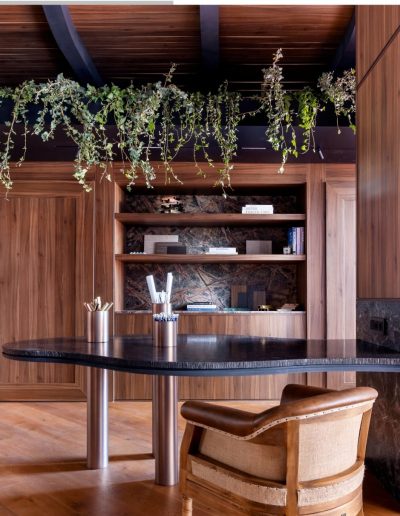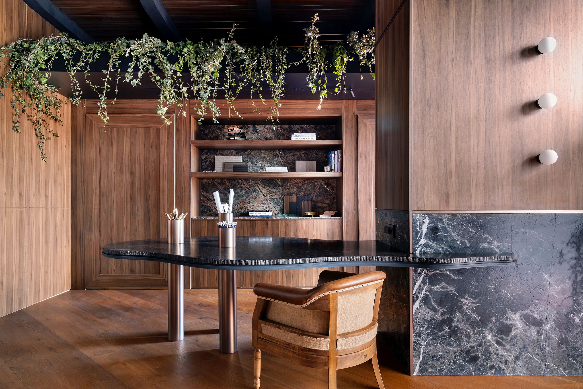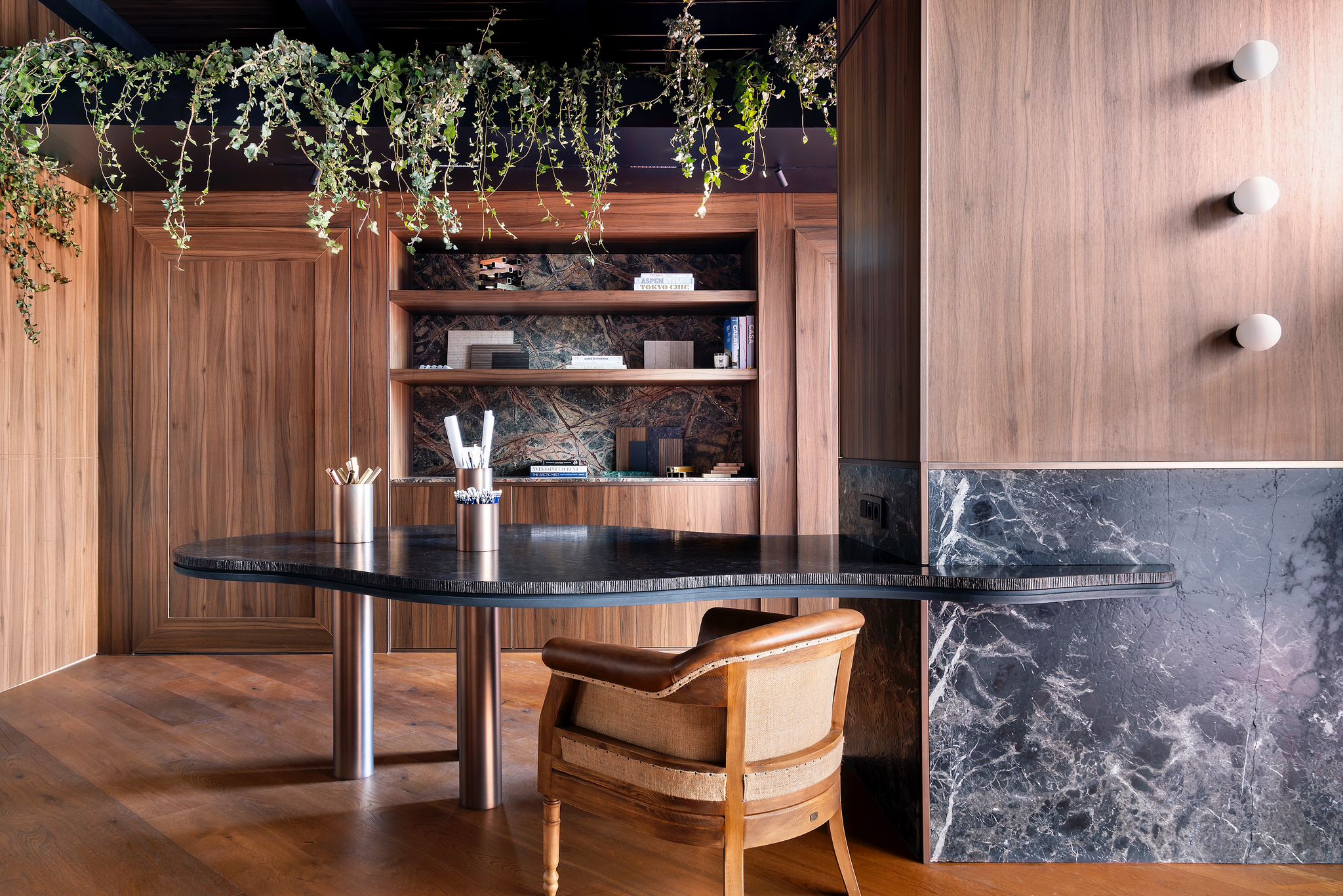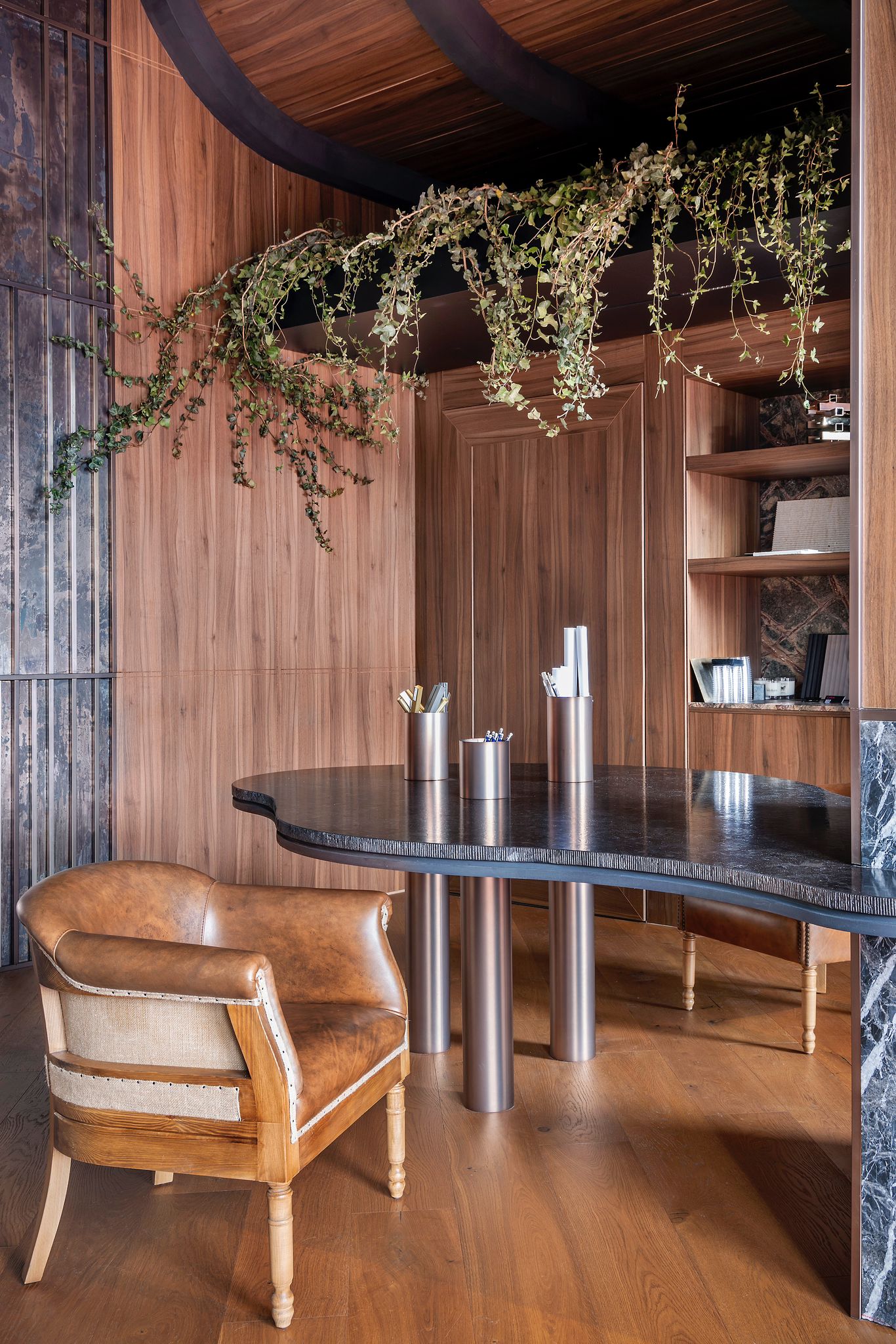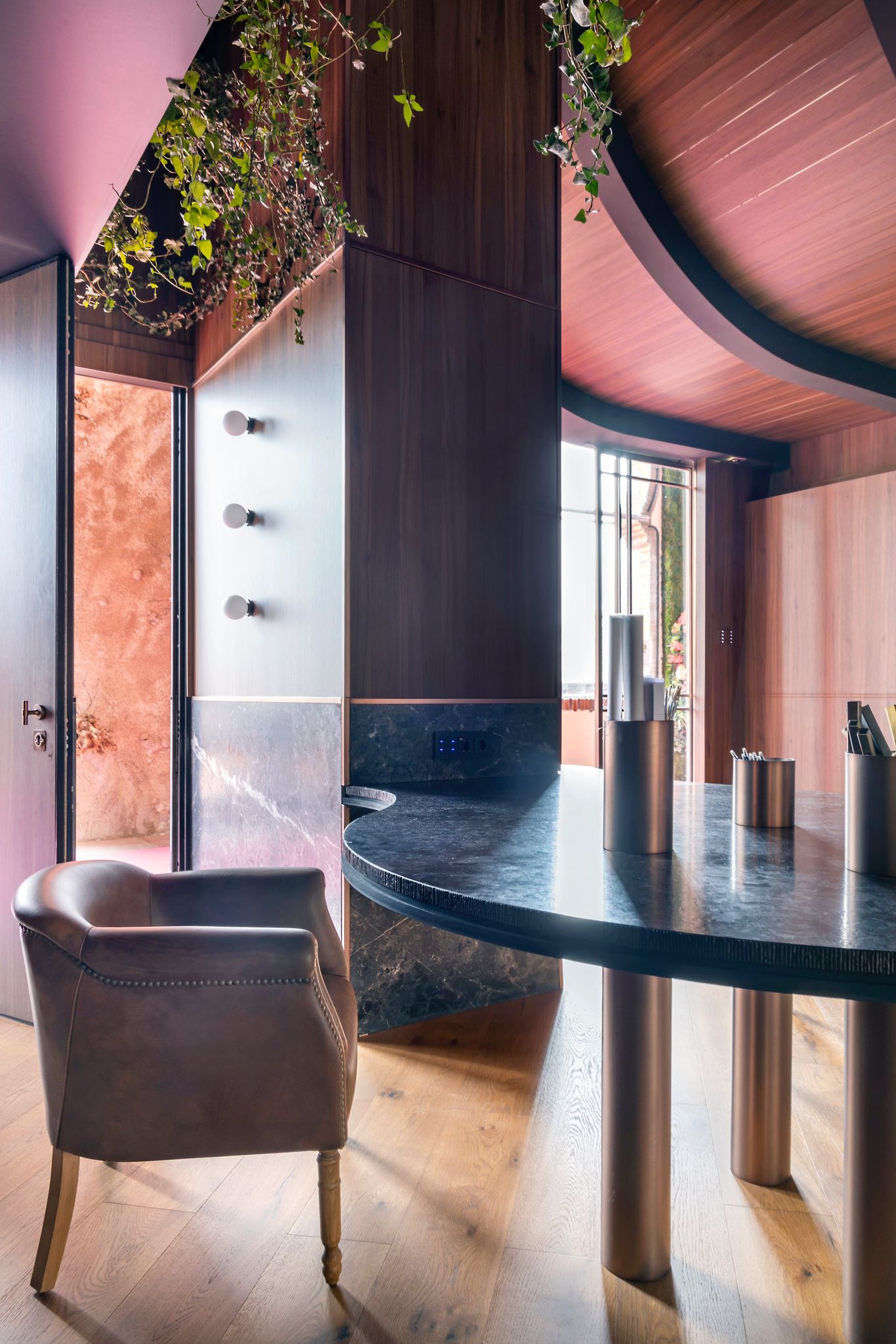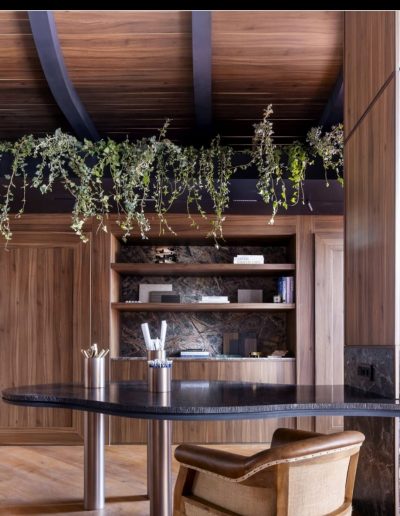 Revestimiento interior de diseño con madera, piedra natural y geometría curva