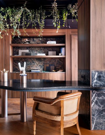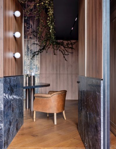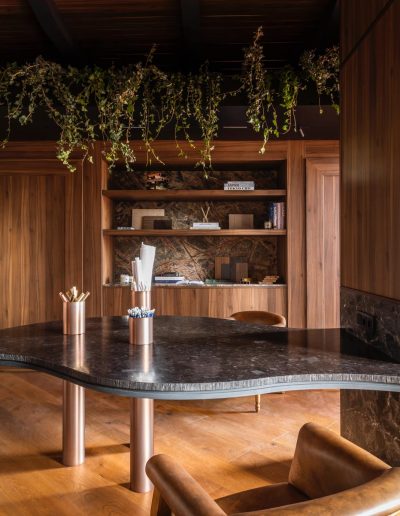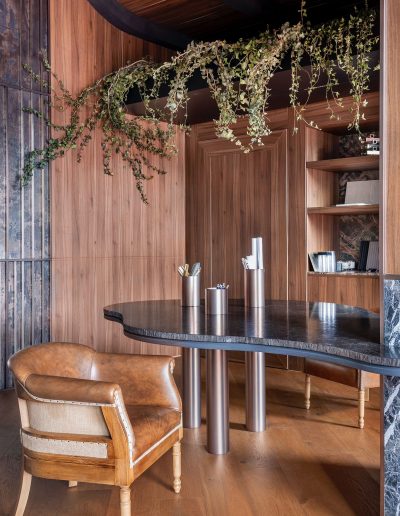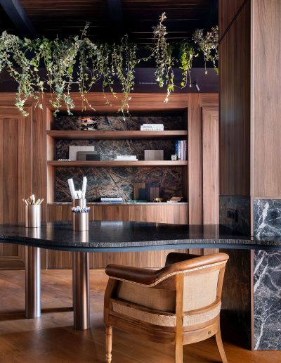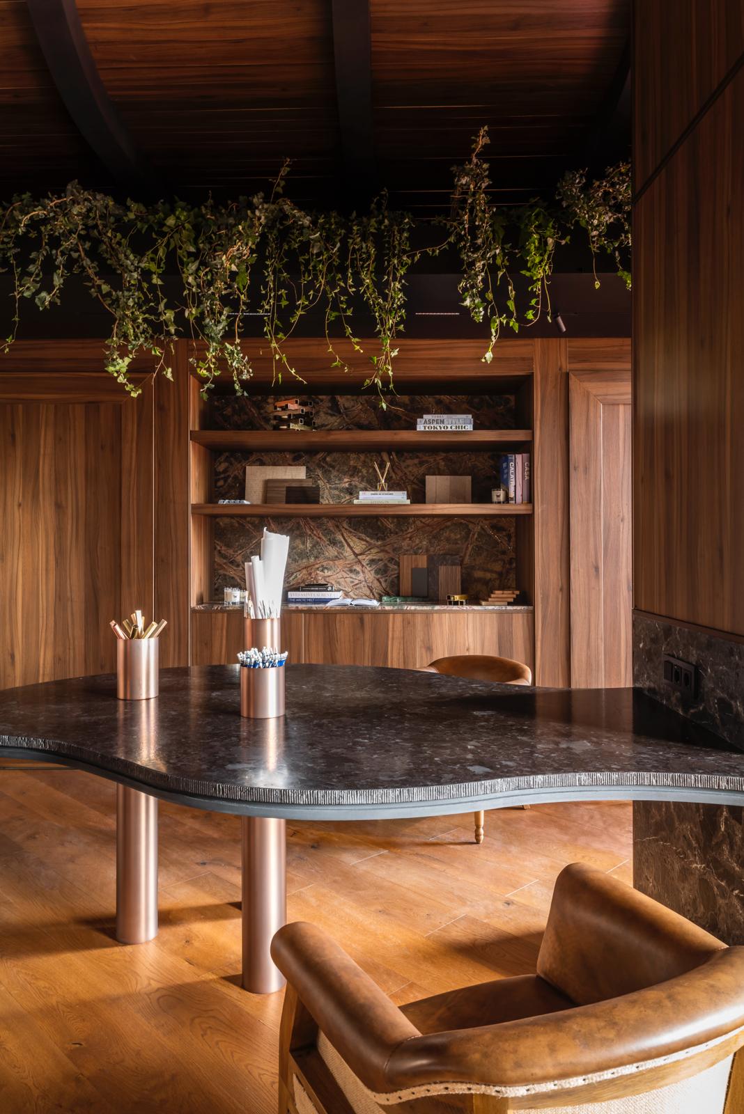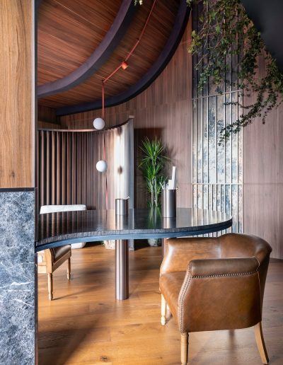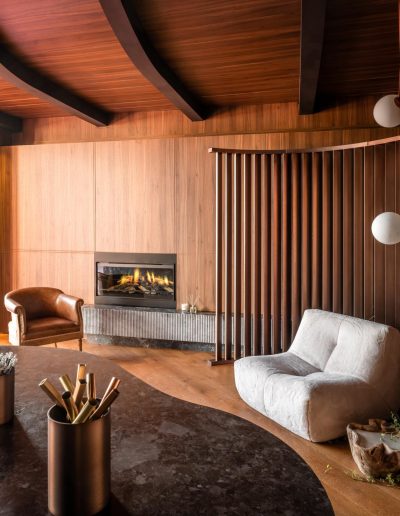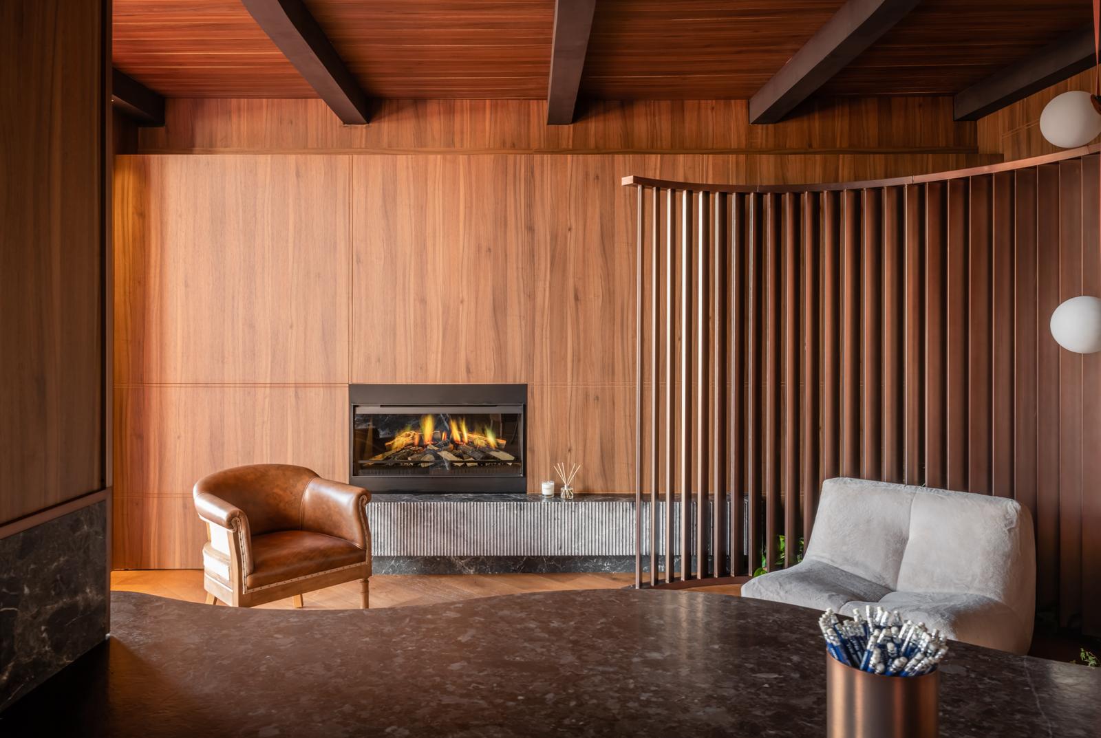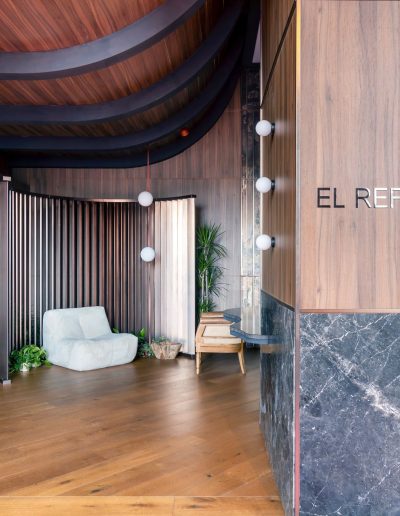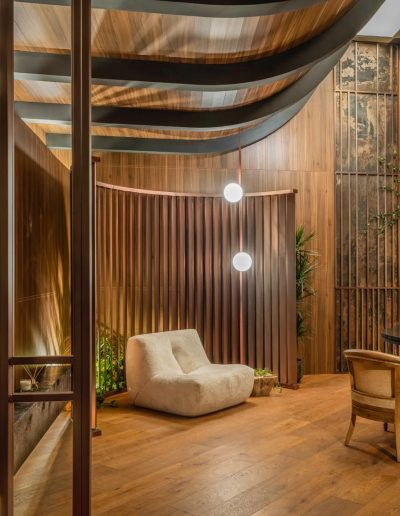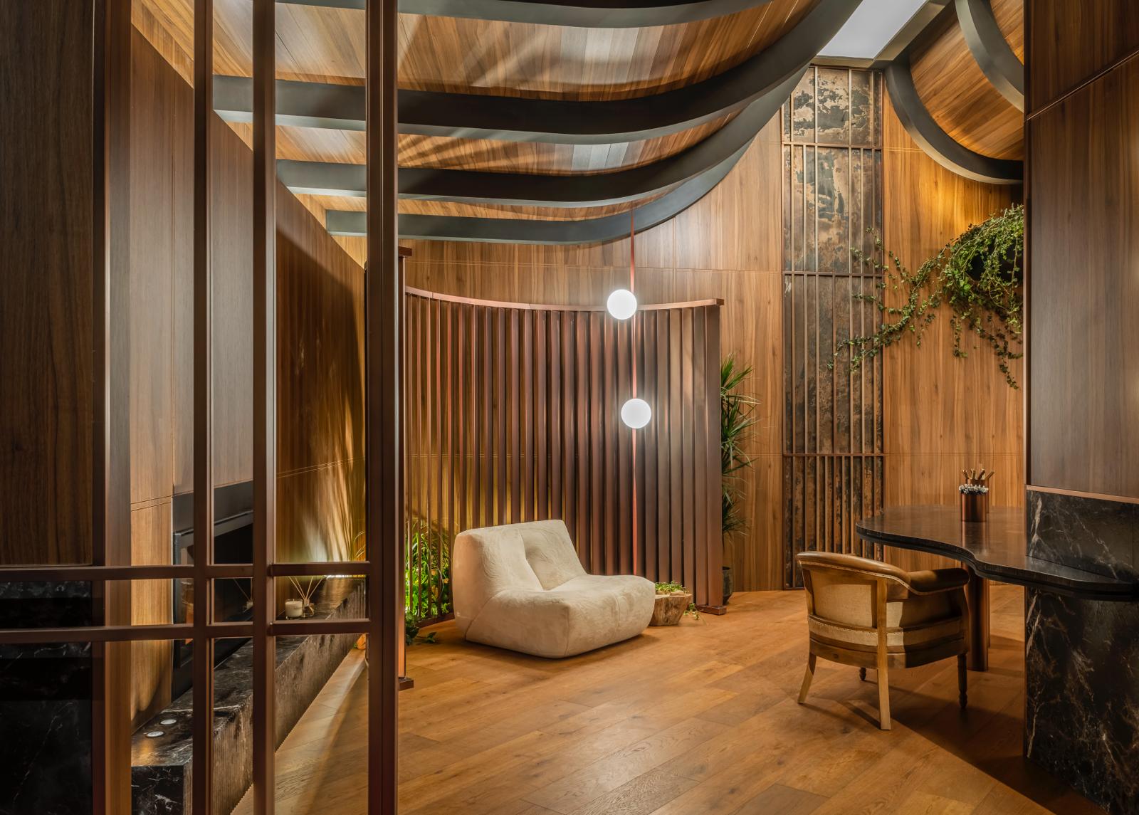 El espacio se define mediante una envolvente continua de madera natural, que cubre paredes y techos, generando una atmósfera cálida, sofisticada y completamente envolvente.