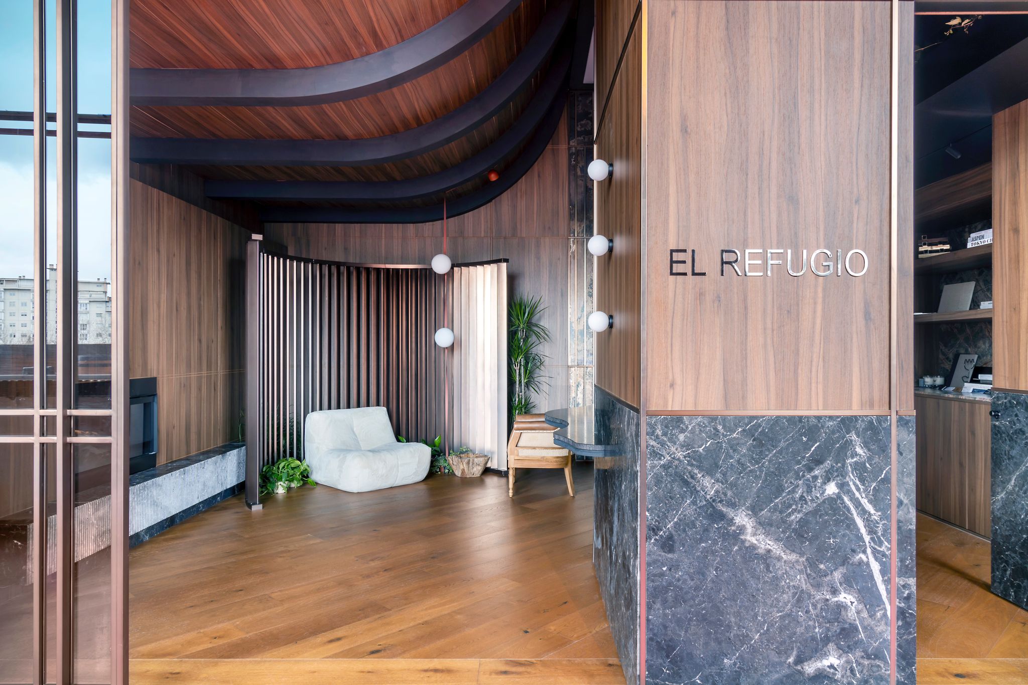 - Techo curvo con vigas estructurales vistas, que aporta movimiento y carácter escultórico
